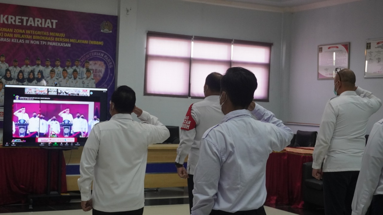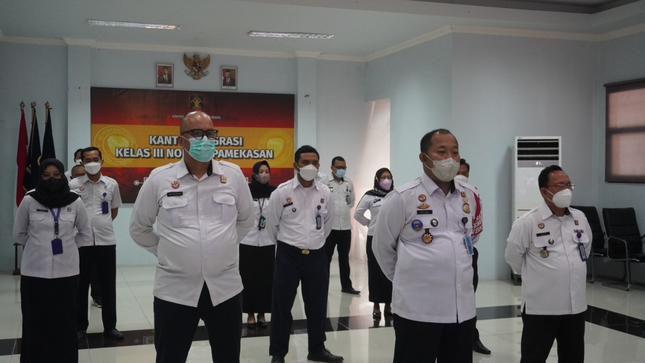 PAMEKASAN - Kementerian Hukum dan HAM (Kemenkumham) Republik Indonesia melaksanakan Kegiatan Apel Pagi secara serentak melalui media teleconference dan diikuti oleh seluruh Kantor Wilayah, termasuk Kanwil Kemenkumham Jawa Timur, beserta UPT se-Indonesia. Kegiatan apel dimulai pada pukul 08:00 WIB. Kepala Kantor Imigrasi (Kakanim) Kelas III Non TPI Pamekasan Imam Bahri beserta pejabat struktural dan jajaran mengikuti kegiatan di Aula Ratu Pamelingan Kantor Imigrasi Kelas III Non TPI Pamekasan.