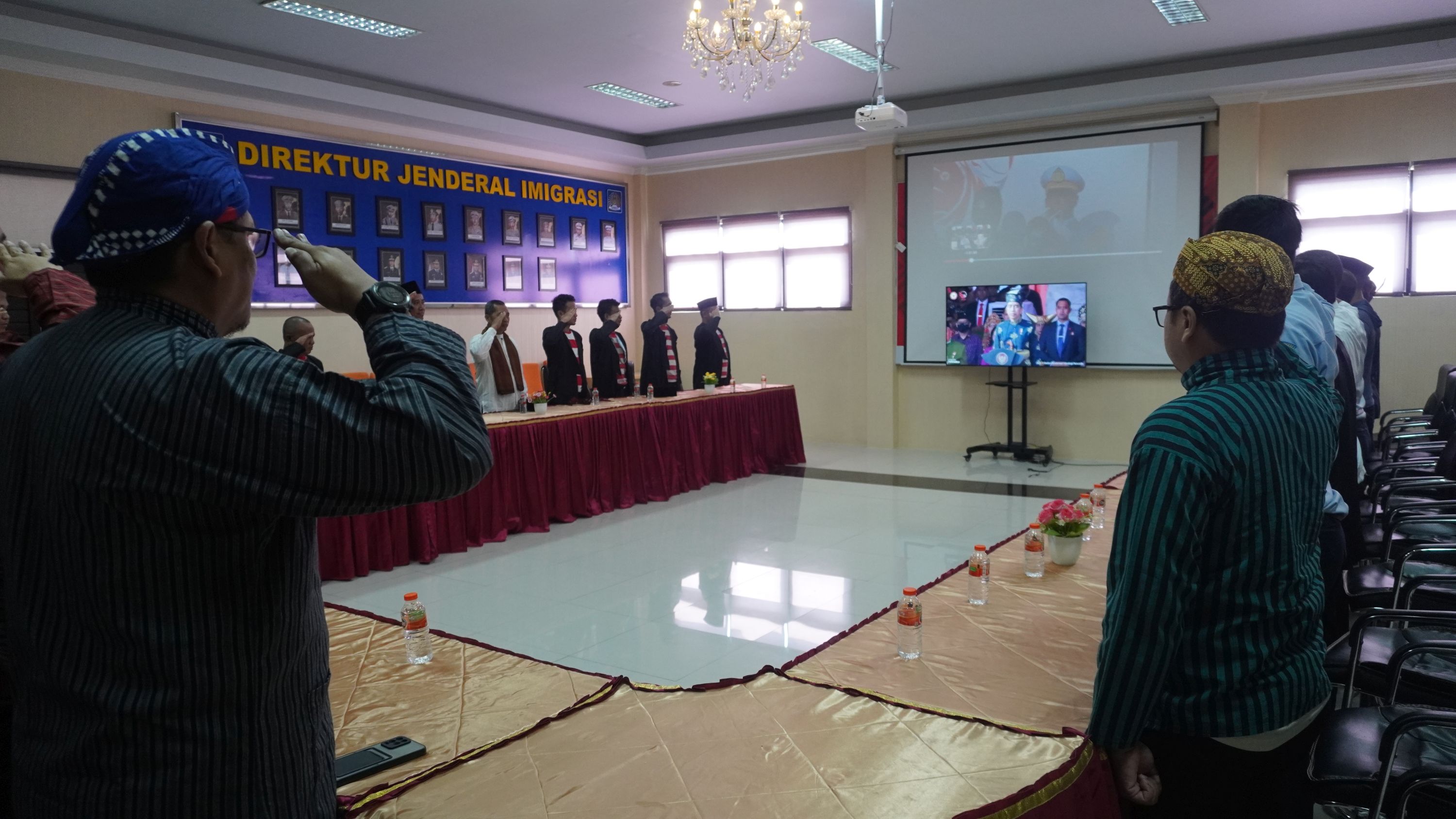 Kepala Kantor Imigrasi Pamekasan Imam Bahri, didampingi oleh sejumlah pejabat seperti Kasubbag Tata Usaha R Pandu Bayuaji, Kasi Tikkim Harsya Wardhana, Kasi Inteldakim Agus Surono, Kasi Doklan-Intal Farhan Ferdiansyah, serta sejumlah pejabat Eselon V dan seluruh ASN terpantau hadir dan mengikuti kegiatan upacara secara virtual via Youtube.