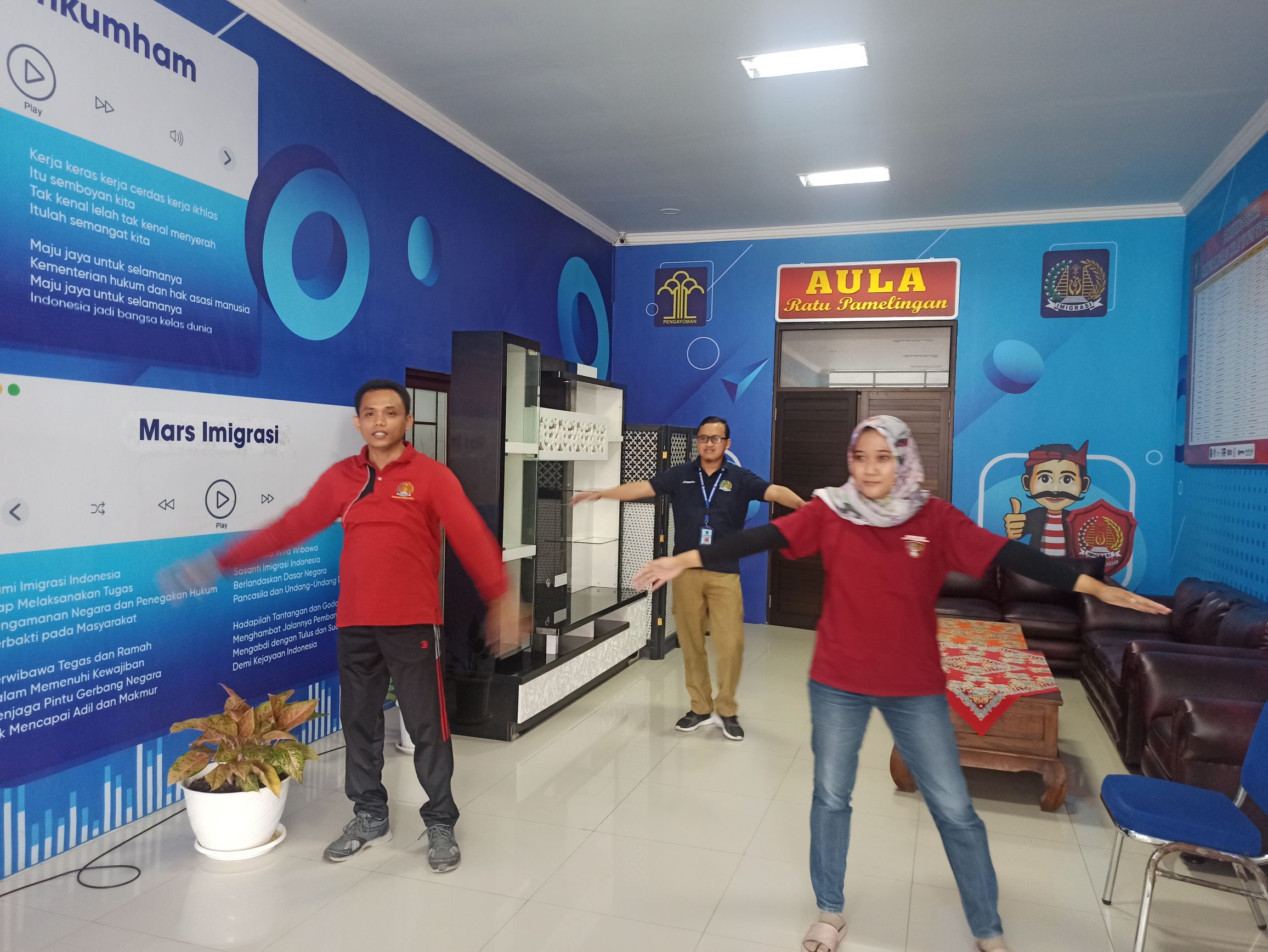 PAMEKASAN - Guna menjaga kebugaran dan kesehatan di tengah pandemi, pegawai Kantor Imigrasi Kelas III Non TPI Pamekasan Kantor Wilayah Kementerian Hukum dan HAM Jawa Timur mengikuti kegiatan senam pagi pada Jumat (02/12/2022). Berlangsung di selasar Ruang Rapat Kantor Imigrasi Kelas III Non TPI Pamekasan, kegiatan senam dipimpin oleh Bang Mamet sebagai instruktur senam. Kegiatan berlangsung secara virtual melalui aplikasi Zoom dan dimulai sebelum jam pelayanan, yaitu jam 08.00 WIB sampai selesai.
