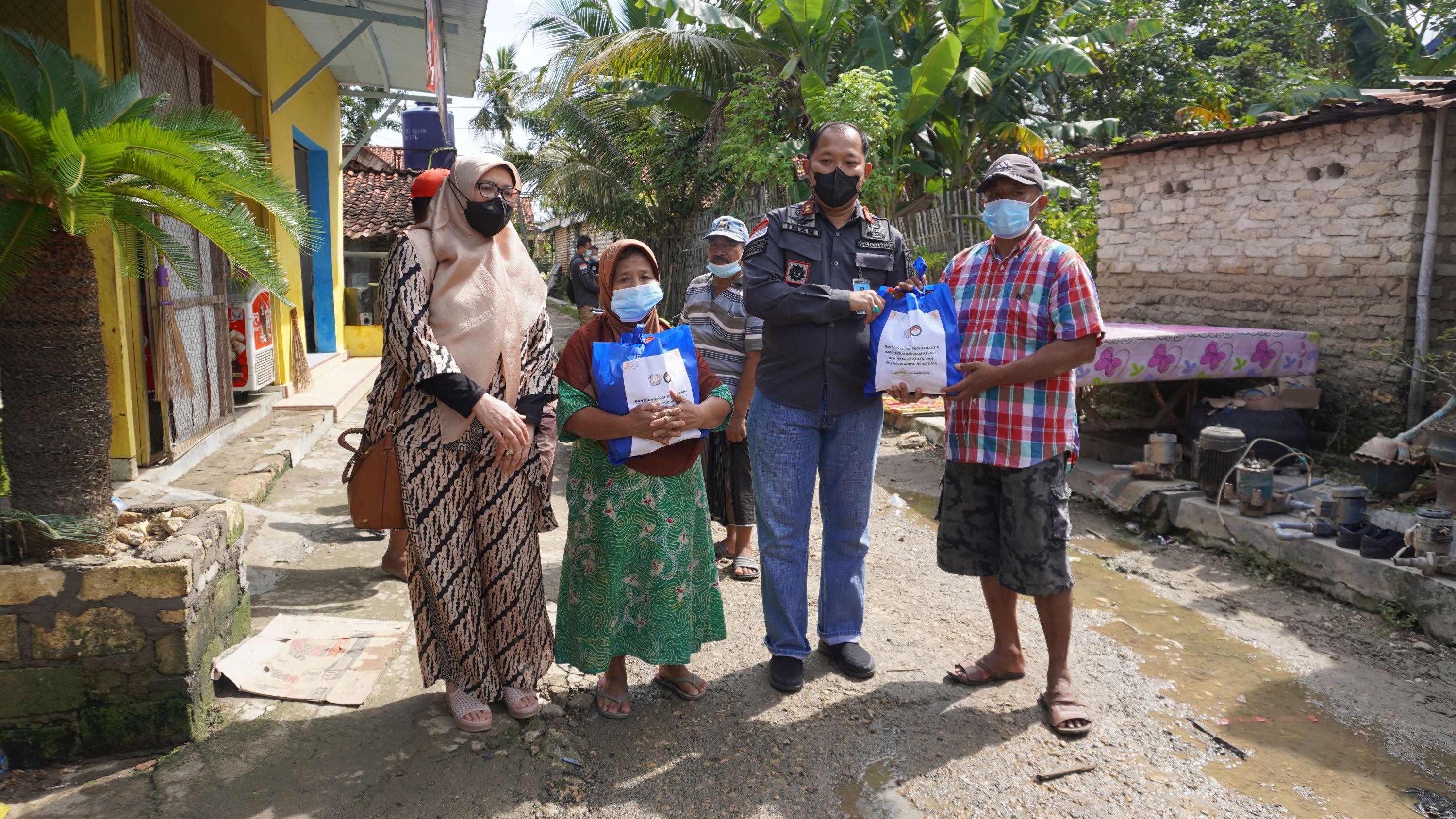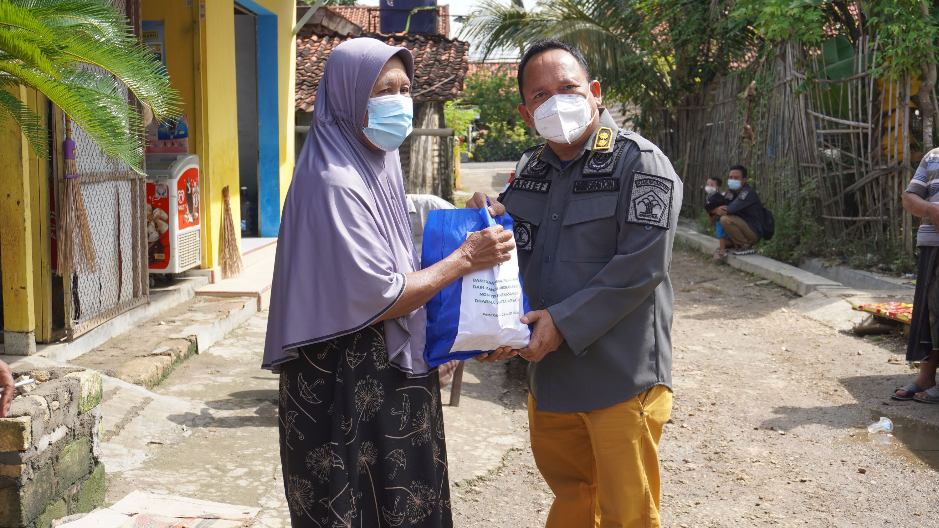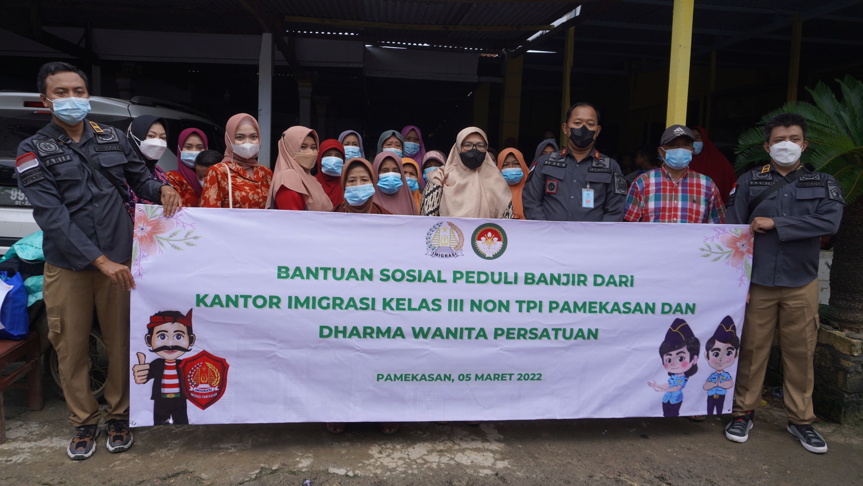 PAMEKASAN - Ibu-Ibu Dharma Wanita Persatuan (DWP) dan segenap pegawai Kantor Imigrasi Kelas III Non TPI Pamekasan Kanwil Kemenkumham Jawa Timur melaksanakan Bhakti Sosial pada Sabtu (5/3). Target utama penerima paket bantuan sosial ini adalah keluarga terdampak banjir yang melanda Kota Pamekasan. Dalam kegiatan ini, Kantor Imigrasi Kelas III Non TPI Pamekasan menyalurkan bantuan berupa sembako sebanyak 44 Paket. Kegiatan Bhakti Sosial sebagai bentuk nyata komitmen Kementerian Hukum dan Hak Asasi Manusia untuk menumbuhkan nilai dan kepekaan sosial dalam diri setiap pegawai di lingkungan Kementerian Hukum dan Hak Asasi Manusia. Kegiatan dipimpin langsung oleh Kepala Kantor Imigrasi Imam Bahri dan dihadiri oleh Kaur Tata Usaha Arief Chandra.