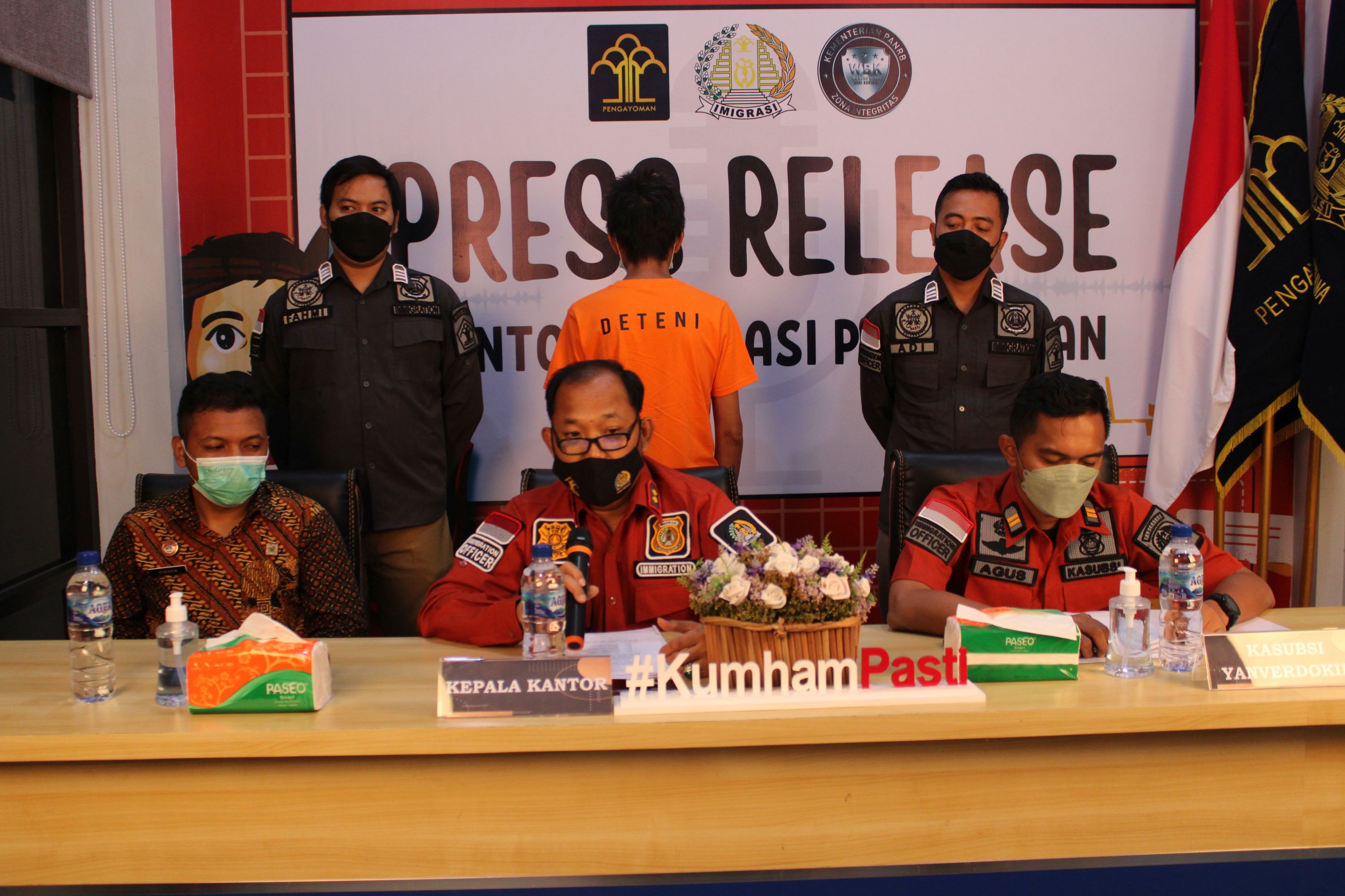 PAMEKASAN - Kantor Imigrasi Kelas III Non TPI Pamekasan Kanwil Kementerian Hukum dan HAM Jawa Timur berhasil mengamankan seorang pria berinisial H asal negeri Jiran Malaysia lantaran tak memiliki dokumen. Hal tersebut disampaikan oleh Kepala Kantor Imigrasi Kelas III Non TPI Pamekasan Imam Bahri, pada Jumat (31/12) sore. Bertempat di ruang Media Center Kantor Imigrasi Kelas III Non TPI Pamekasan Kanwil Kementerian Hukum dan HAM Jawa Timur, Kepala Kantor Imigrasi Imam Bahri menyampaikan proses terduga WNA tersebut bisa masuk ke Indonesia.