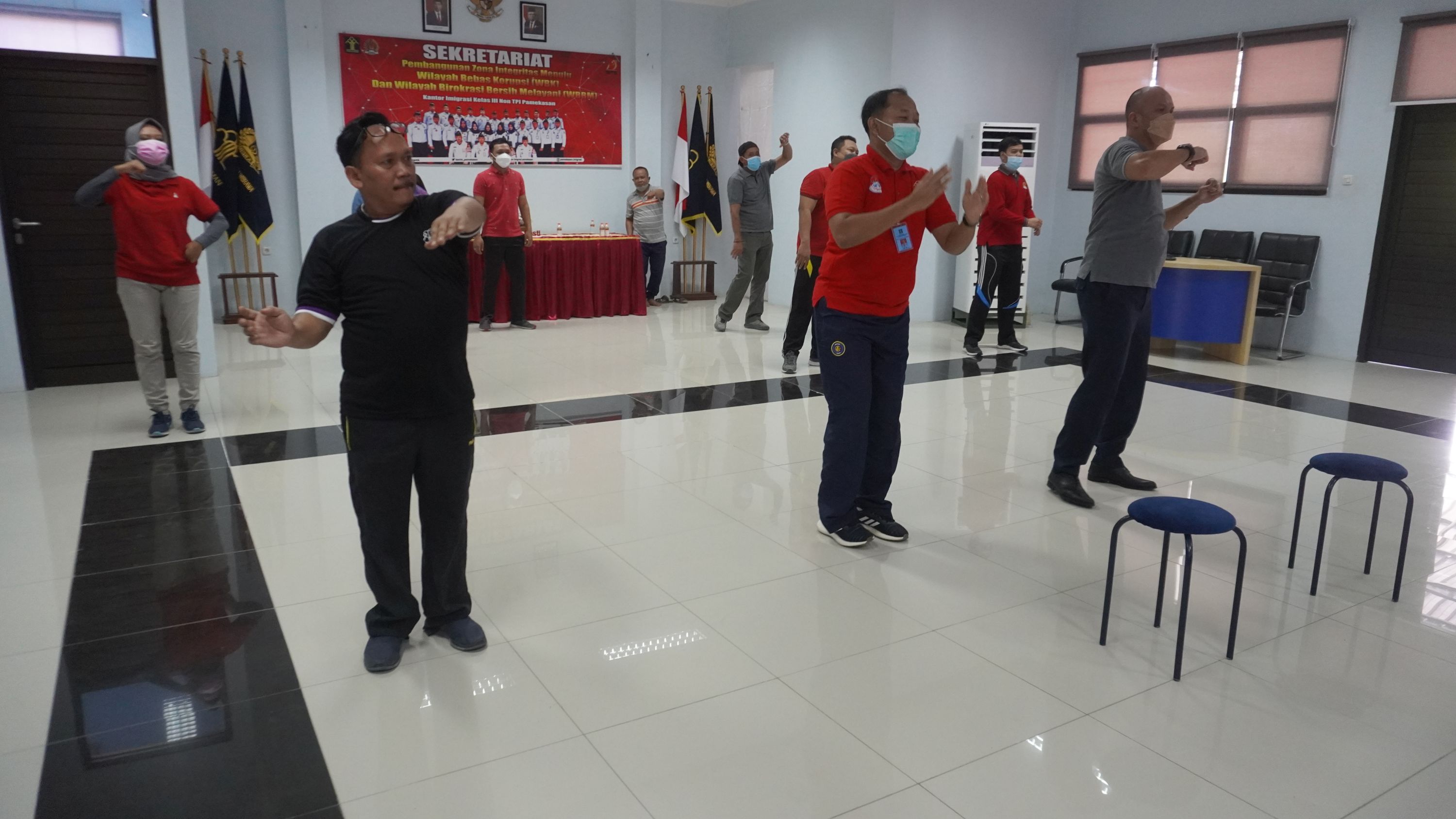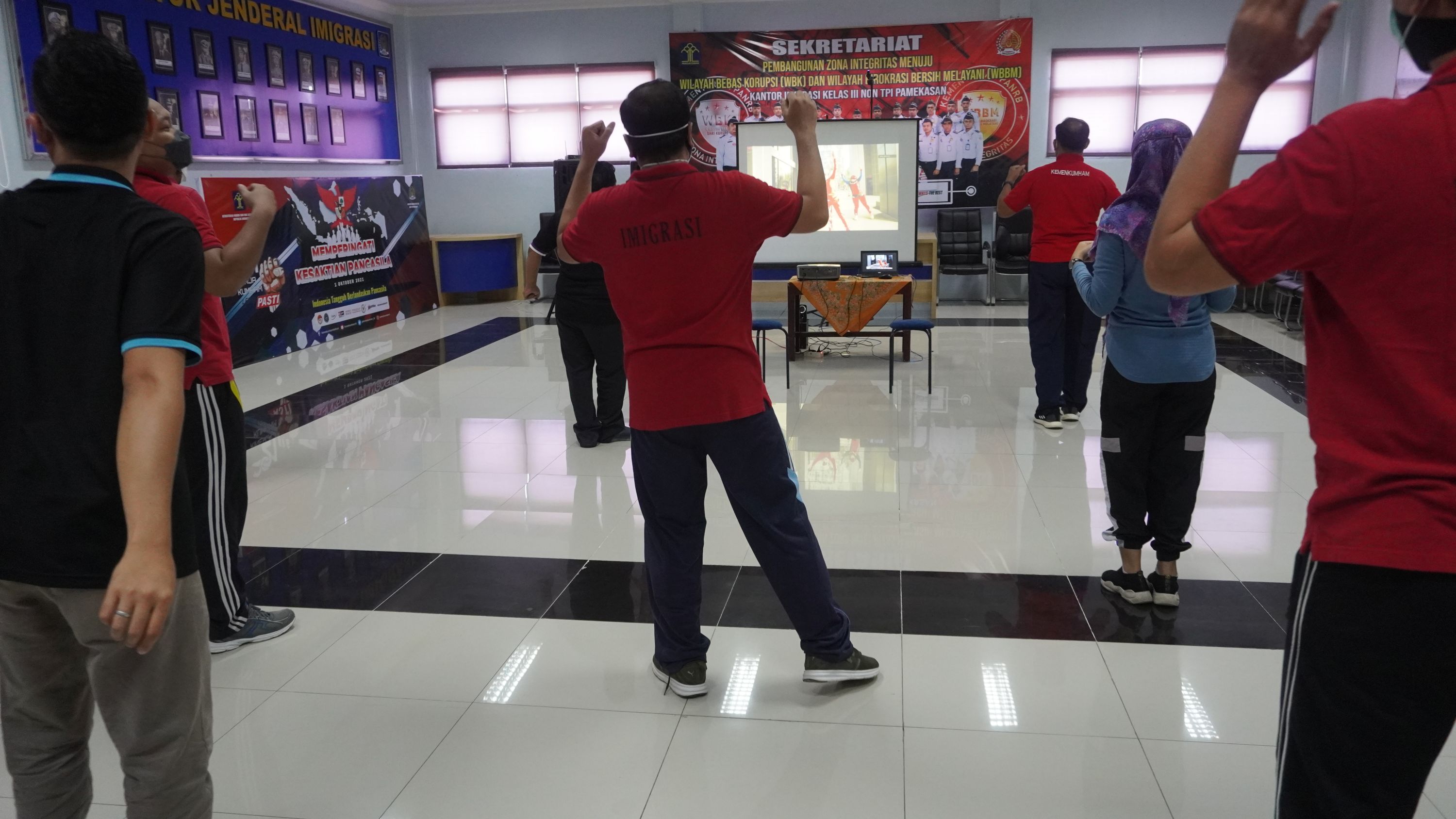 Kantor Imigrasi Kelas III Non TPI Pamekasan Kementerian Hukum dan HAM Jawa Timur juga turut serta dalam kegiatan ini. Kepala Kantor Imigrasi Imam Bahri, pejabat struktural, dan sejumlah ASN, dengan tetap menerapkan protokol kesehatan. Menggunakan pakaian olahraga dan berlokasi di Aula Ratu Pamelingan Kantor Imigrasi Kelas III Non TPI Pamekasan, para pegawai mengikuti kegiatan senam virtual dengan semangat. Jenis senam virtual yang dilakukan adalah olah raga Senam Penapasan/Jantung dan Aerobic. Senam ini dipimpin oleh Miss Nungki dan Tim sebagai instruktur olahraga.