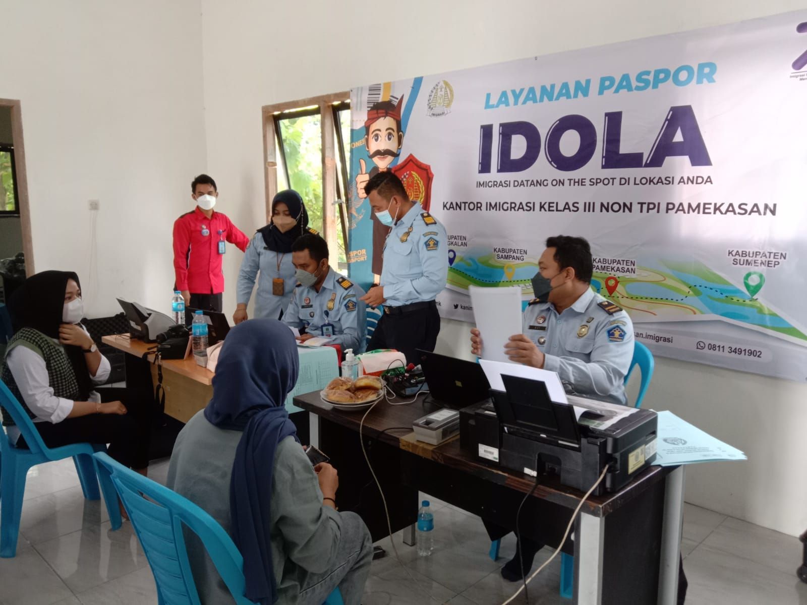 PAMEKASAN - Dalam rangka memberikan kemudahan pembuatan paspor kepada masyarakat di kala pandemi, Kantor Imigrasi Kelas III Non TPI Pamekasan Kanwil Kemenkumham Jawa Timur kembali menghadirkan solusi berupa layanan Paspor IDOLA. Kali ini, layanan yang merupakan akronim dari Imigrasi Datang On the spot di Lokasi Anda ini diberikan kepada para pemohon paspor di daerah Ketapang, Kabupaten Sampang. Mudahnya membuat paspor secara kolektif, dapat dirasakan secara langsung oleh para jamaah.