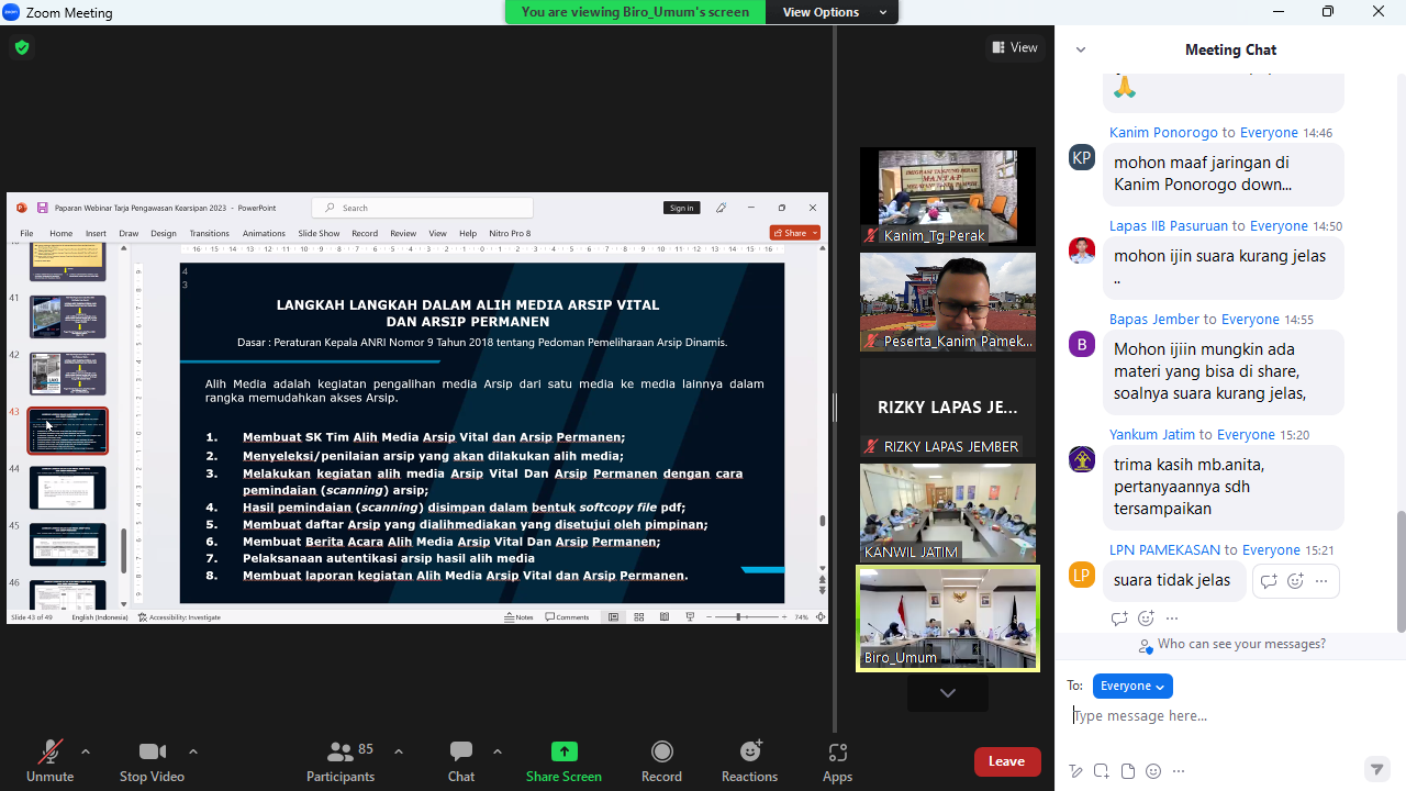 PAMEKASAN - Kantor Imigrasi Kelas II Non TPI Pamekasan Kanwil Kemenkumham Jawa Timur mengikuti kegiatan bimbingan teknis digitalisasi arsip, pemusnahan arsip, dan tata naskah dinas secara virtual melalui media zoom meeting di ruang Humas dan IT Control Kantor Imigrasi Kelas II Non TPI Pamekasan pada Selasa (21/02/2023) hari ini.