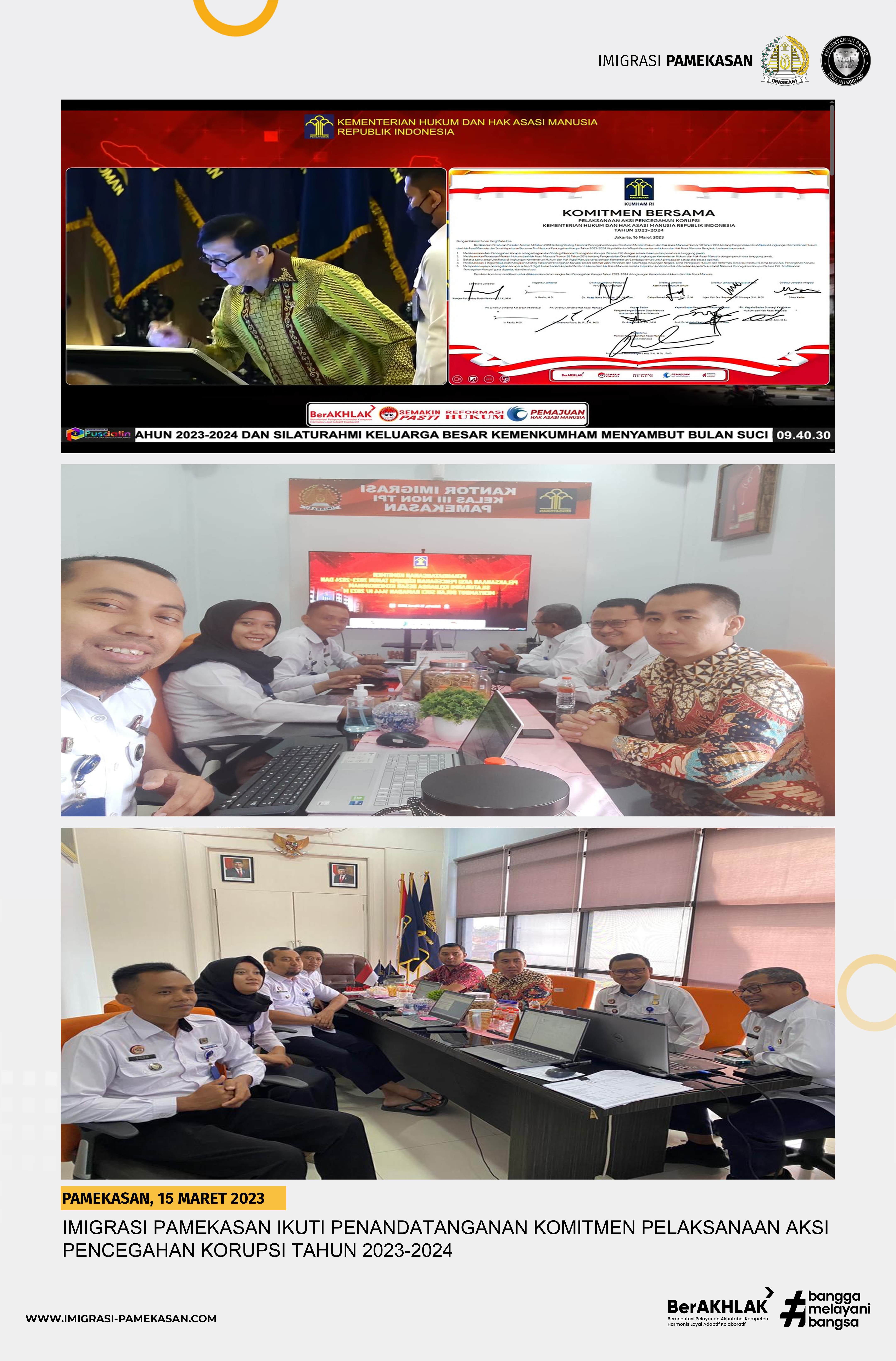 PAMEKASAN - Penandatanganan komitmen aksi pencegahan korupsi tahun 2023 hingga 2024 merupakan wujud komitmen Kementerian Hukum dan HAM untuk melakukan pencegahan korupsi. Kantor Imigrasi Kelas II Non TPI Pamekasan sebagai salah satu unit pelaksana teknis di bawah jajaran Kanwil Kemenkumham Jawa Timur terus berupaya mewujudkan komitmen pencegahan korupsi, salah satunya dengan mengikuti kegiatan Penandatanganan Komitmen Pelaksanaan Aksi Pencegahan Korupsi dengan tema "Birokrasi Kemenkumham Yang Melayani" pada Kamis (16/03/2023).