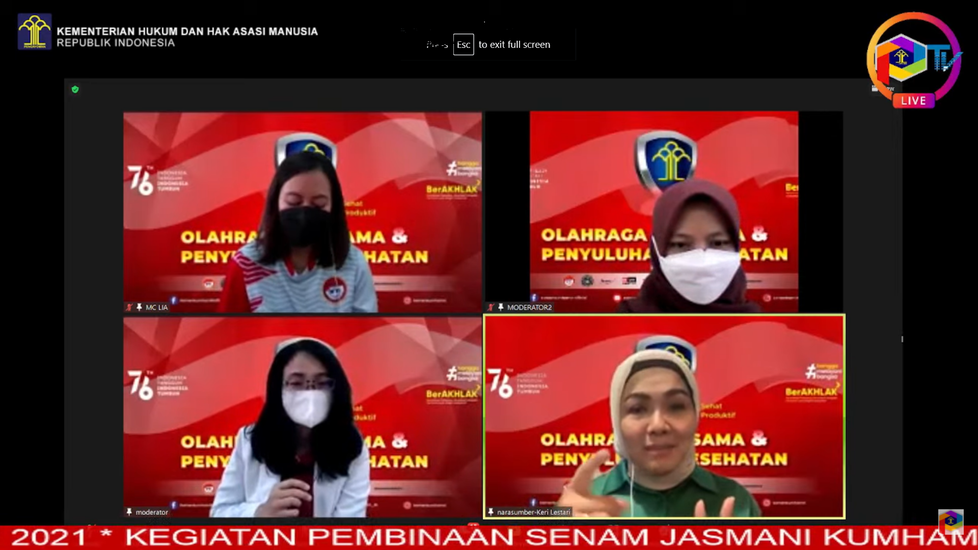 Usai kegiatan senam virtual selesai, acara dilanjutkan dengan mengikuti Penyuluhan Kesehatan. Acara Penyuluhan Kesehatan dimoderatori oleh dr. Farancisca Kusuma Utari dan Apt. Nofi Milda, S. Farm dari tenaga kesehatan Badan Pengembangan Sumber Daya Manusia (BPSDM) Kementerian Hukum dan HAM. Sebagai narasumber adalah Prof. Dr. Apt. Keri Lestari, S.Si., M.Si. Prof Keri merupakan Guru Besar Fakultas farmakologi dan Farmasi Klinik Universitas Padjadjaran. Prof Keri menyampaikan paparan pangan fungsional untuk meningkatkan imunitas di masa pandemi.