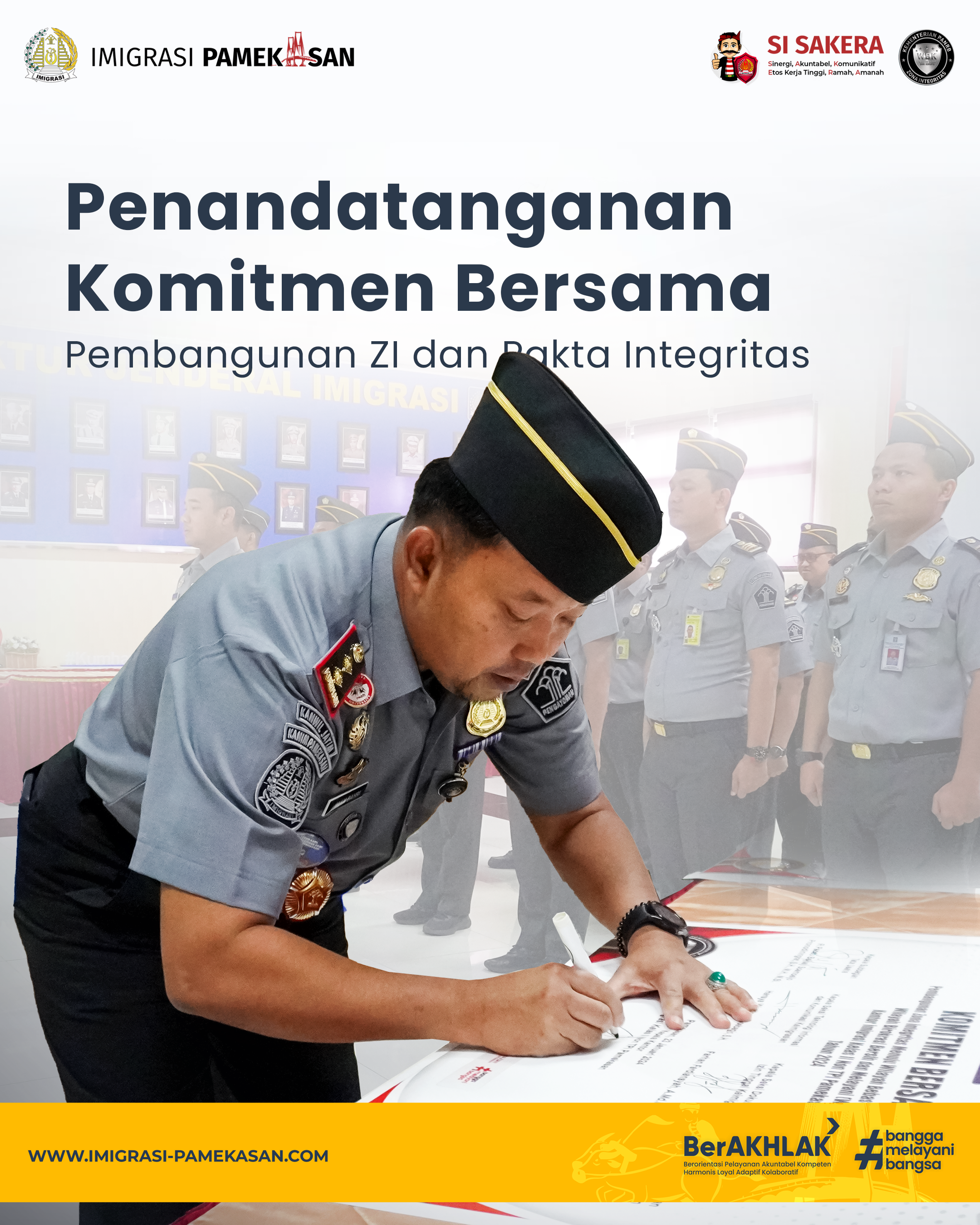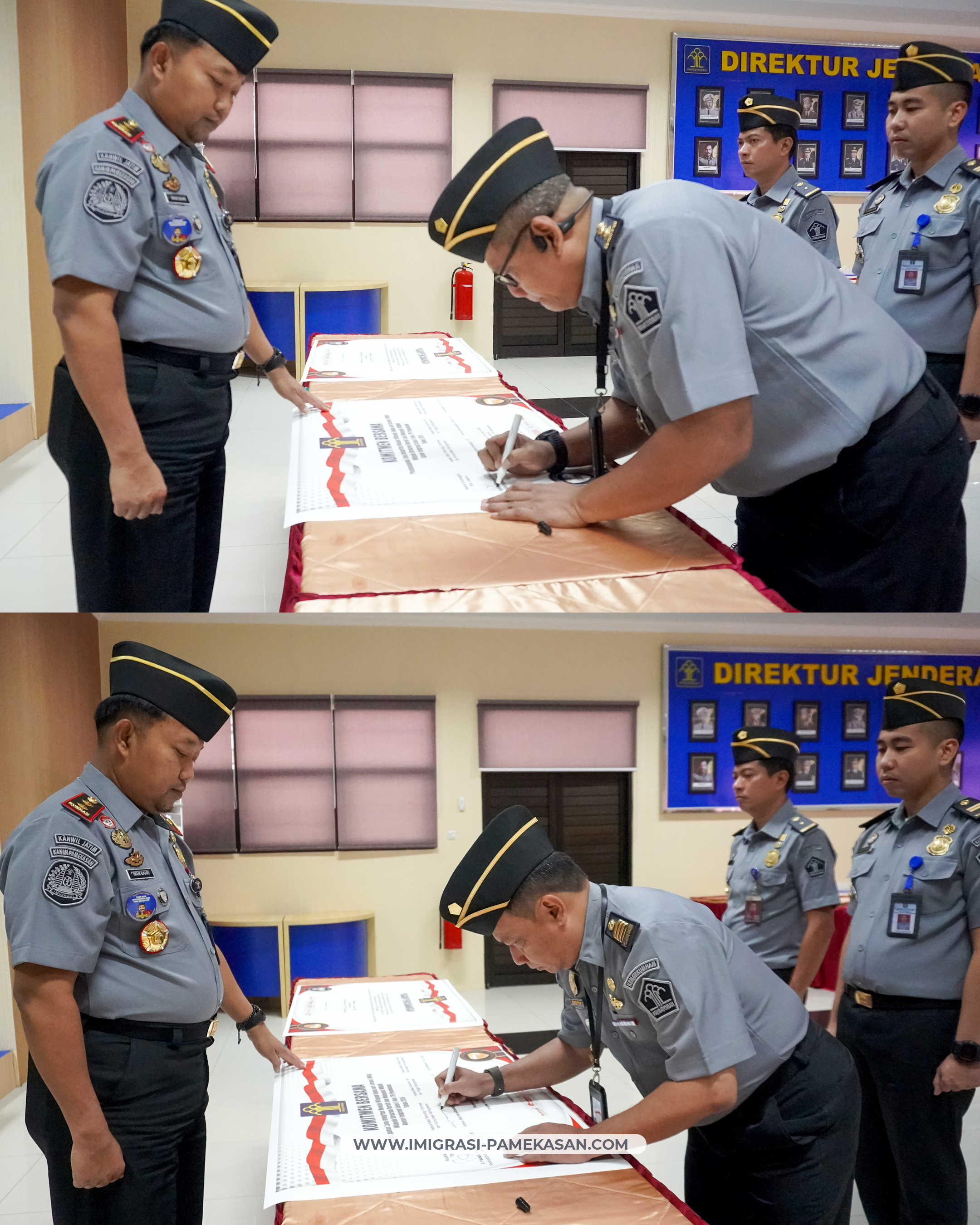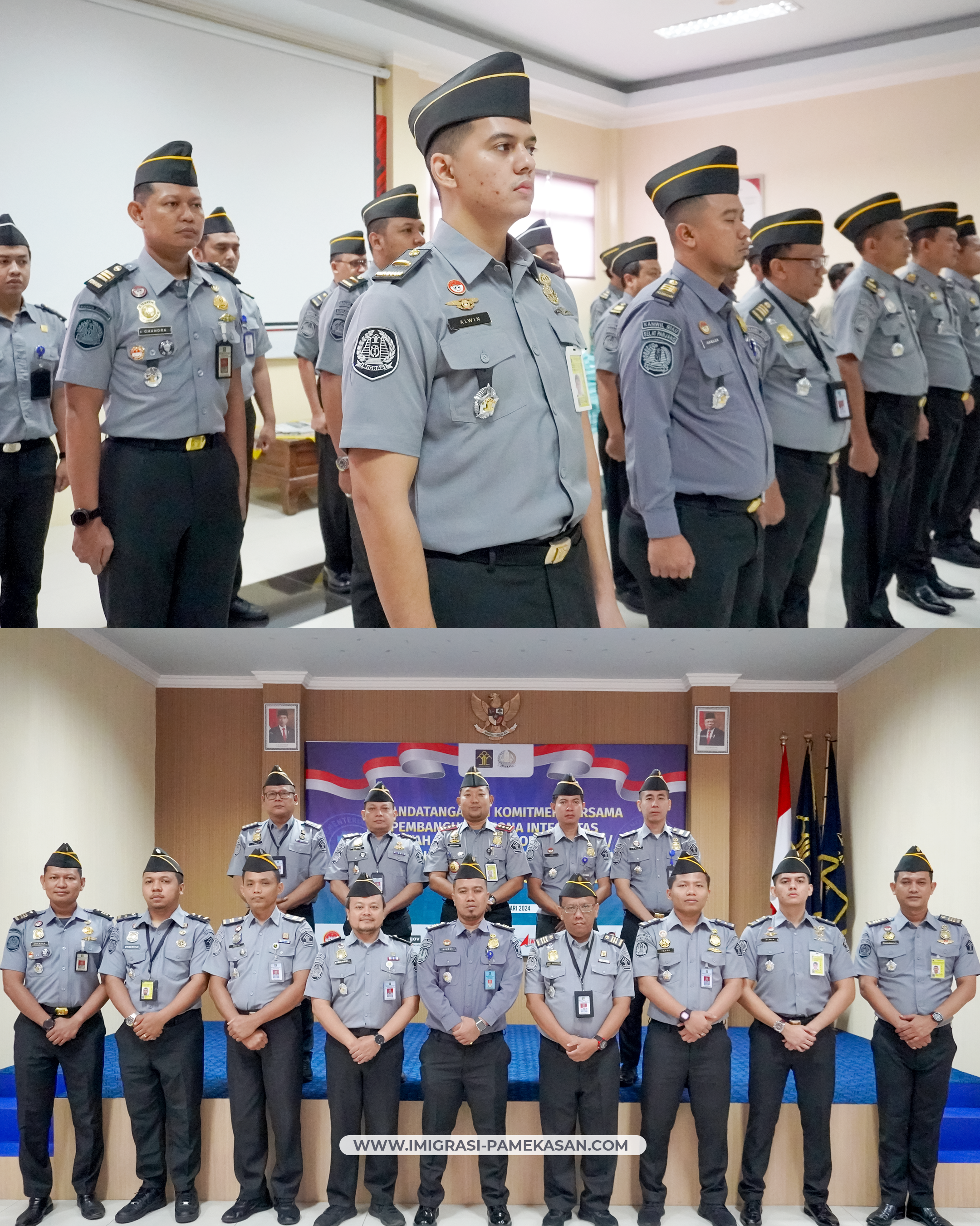 PAMEKASAN - Kantor Imigrasi Kelas II Non TPI Pamekasan Kantor Wilayah Kementerian Hukum dan HAM Jawa Timur melaksanakan kegiatan Apel Deklarasi Janji Kinerja serta Penandatanganan Komitmen Bersama Pembangunan Zona Integritas Menuju Wilayah Bebas Korupsi (WBK) dan Wilayah Birokrasi Bersih Melayani (WBBM) Tahun 2024, bertempat di Ruang Aula Ratu Pamelingan Kantor Imigrasi Kelas II Non TPI Pamekasan Kantor Wilayah Kementerian Hukum dan HAM Jawa Timur pada Selasa (23/01). Kegiatan apel dipimpin langsung oleh Kepala Kantor Imigrasi (Kakanim) Imam Bahri didampingi sejumlah pejabat struktural.