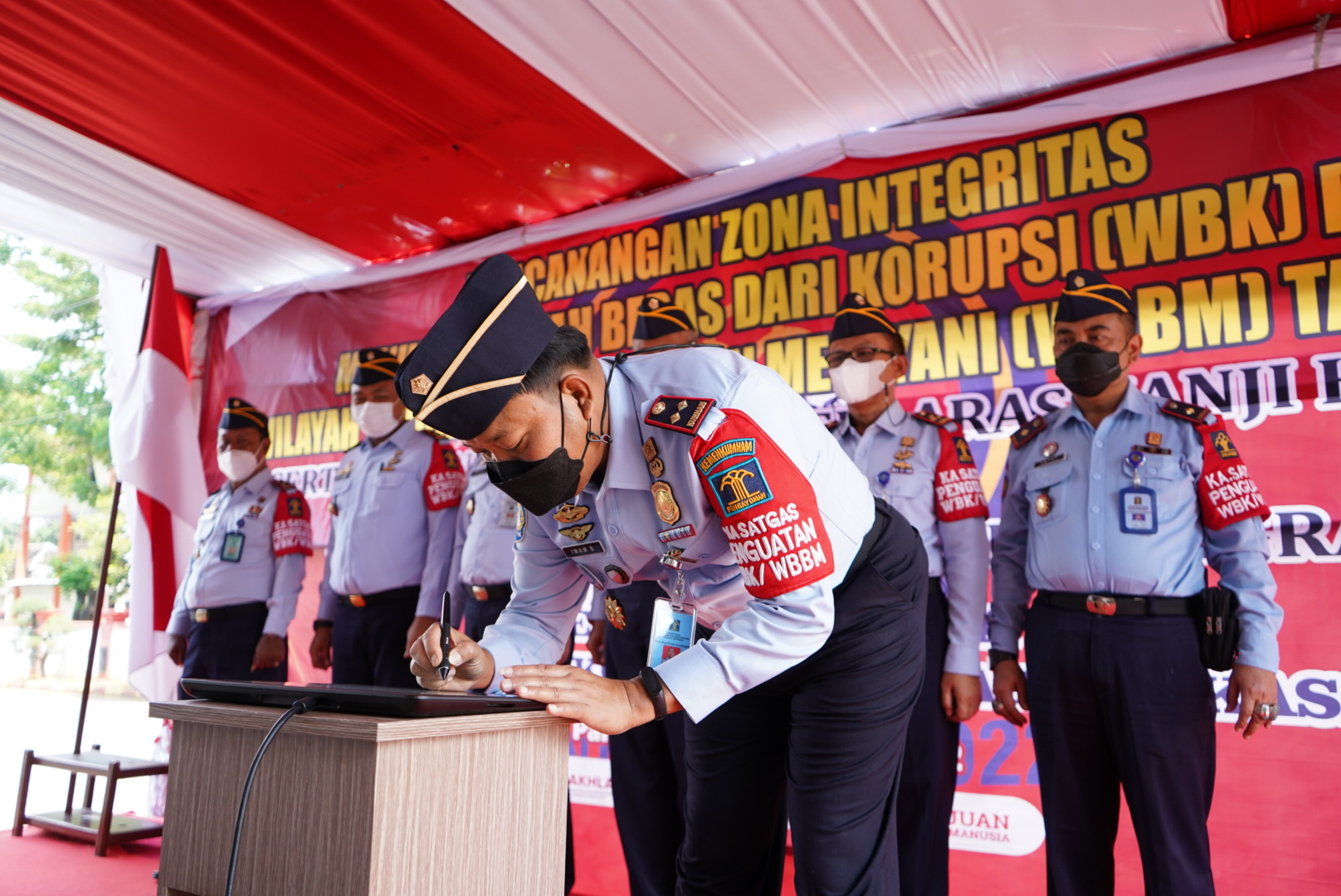 PAMEKASAN - Kantor Wilayah Kementerian Hukum dan HAM Jawa Timur Koordinator Wilayah (Korwil) Madura melaksanakan kegiatan Deklarasi Janji Kinerja serta Penandatanganan Komitmen Bersama Pembangunan Zona Integritas Menuju Wilayah Bebas Korupsi (WBK) dan Wilayah Birokrasi Bersih Melayani (WBBM) Tahun 2022, bertempat di Lapangan Lapas Narkotika Kelas IIA Pamekasan pada Selasa (11/01). Kantor Imigrasi Kelas III Non TPI Pamekasan Kanwil Kemenkumham Jawa Timur sebagai satu-satunya satuan kerja keimigrasian di korwil Madura mengikuti kegiatan ini secara langsung, dengan dihadiri oleh Kepala Kantor Imigrasi Imam Bahri dan Kaur Tata Usaha Arief Chandra.