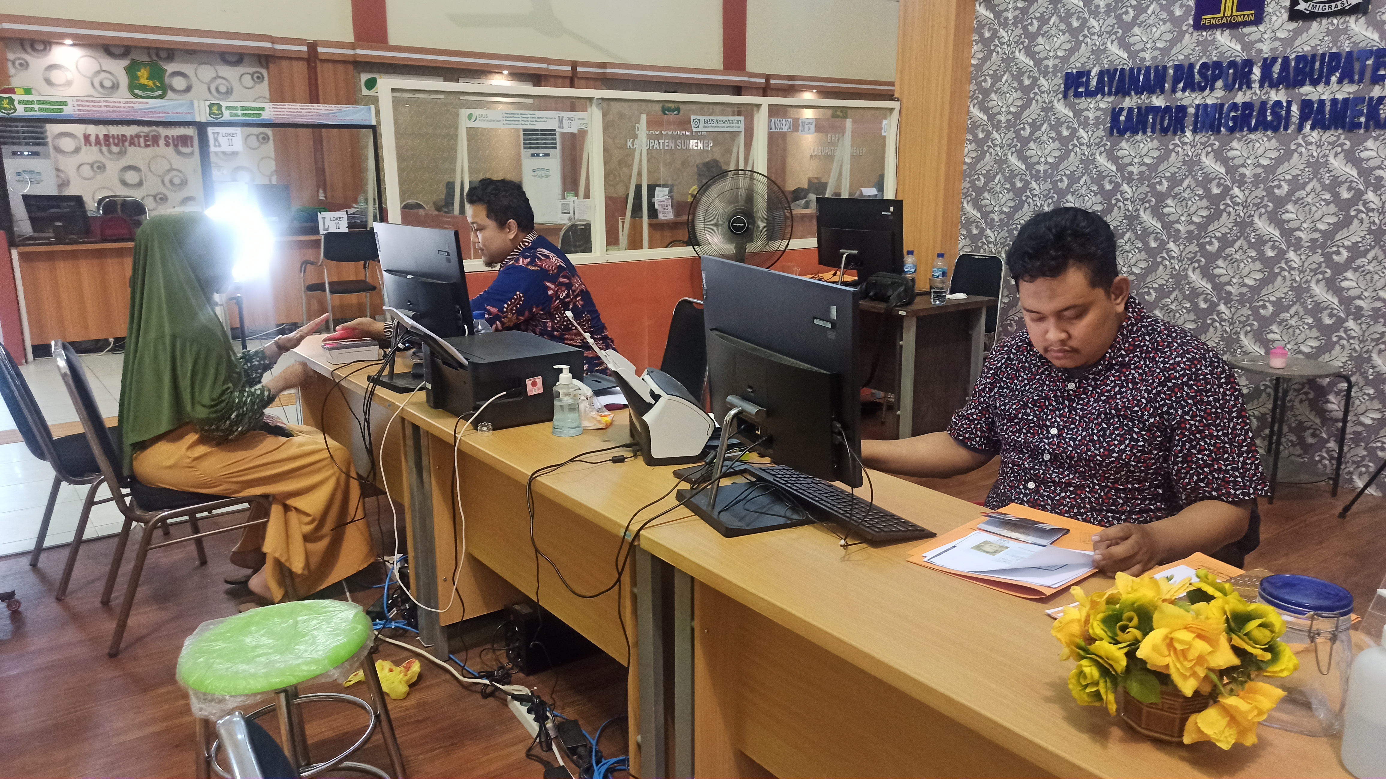 SUMENEP - Layanan keimigrasian Kantor Imigrasi Kelas II Non TPI Pamekasan Kanwil Kemenkumham Jawa Timur di Mal Pelayanan Publik (MPP) Sumenep masih diminati oleh pemohon. Masih berlakunya pandemi Covid tak menghalangi minat masyarakat dalam mengajukan permohonan paspor untuk bepergian ke luar negeri. Hal ini terbukti dari kedatangan 20 orang pemohon pada Kamis (02/03/2023) sesuai jumlah kuota antrian online yang diberikan. Berlokasi di Jalan Dr. Soetomo Kecamatan Pejagalan Sumenep, proses layanan Paspor berlangsung lancar.