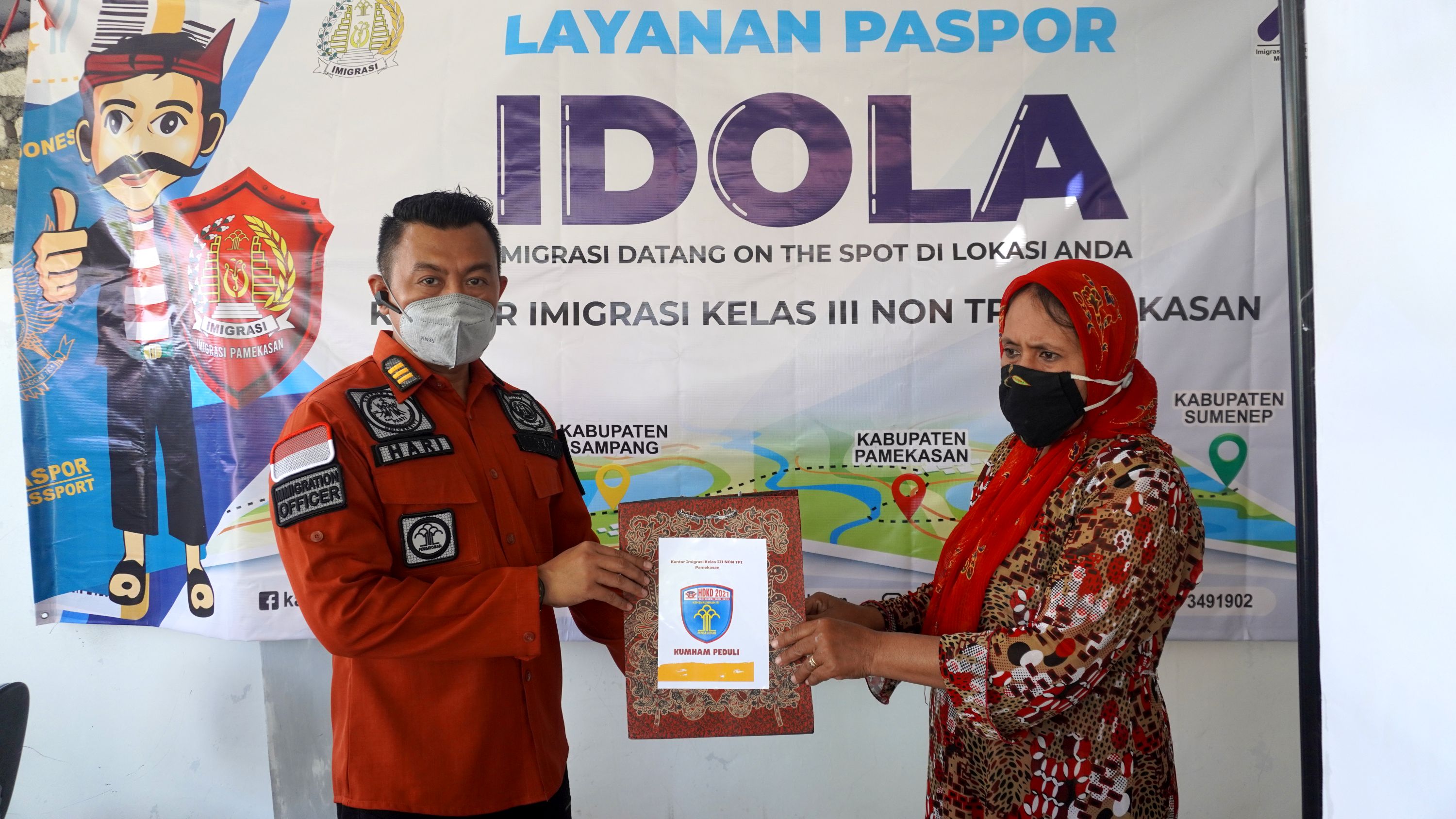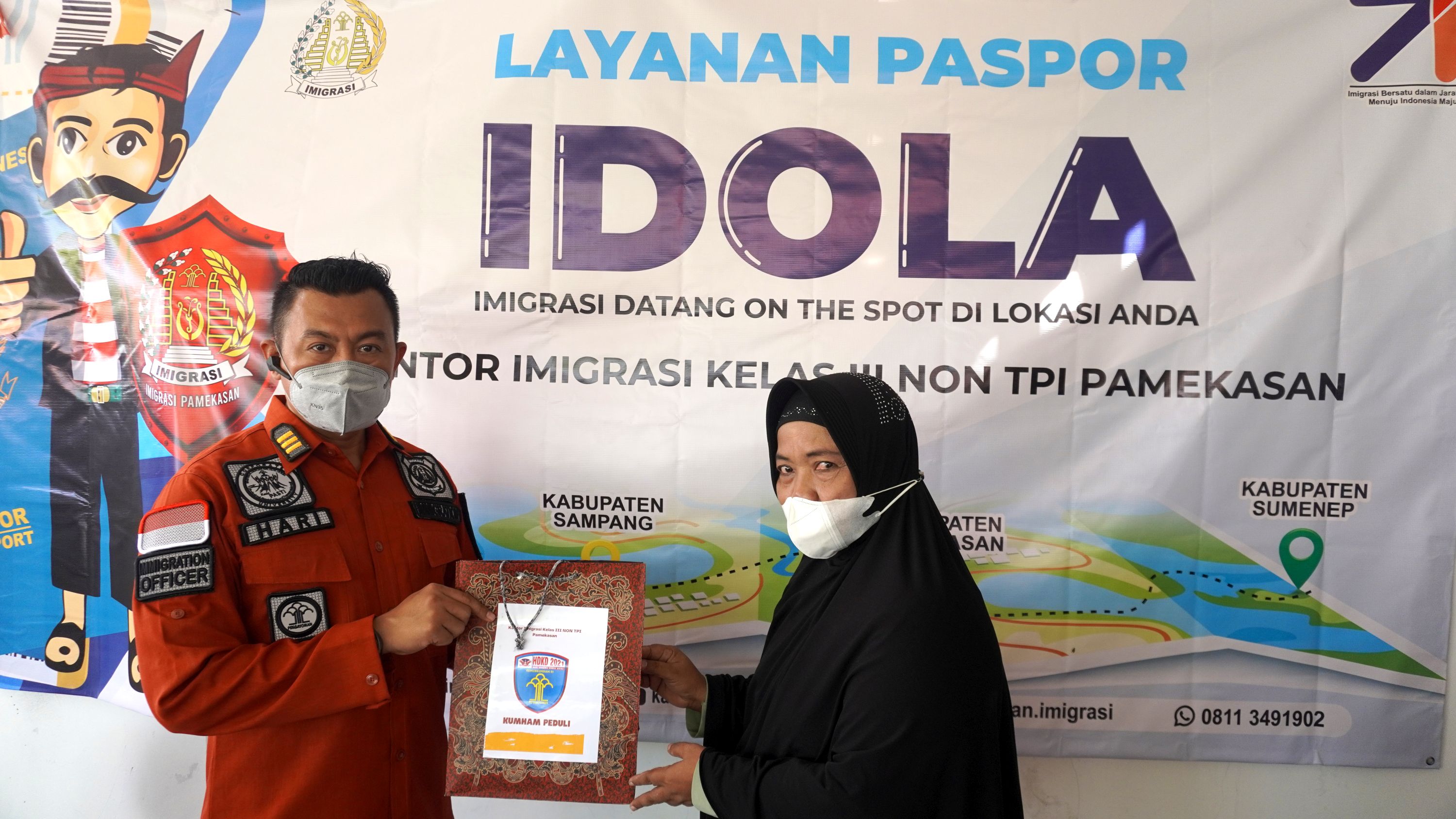 Kepala Kantor Imigrasi (Kakanim) Kelas III Non TPI Pamekasan Kanwil Kemenkumham Jawa Timur Imam Bahri mengatakan, kegiatan ini dilaksanakan serentak oleh semua satker atau unit pelaksana teknis di jajaran Kementerian Hukum dan Hak Asasi Manusia (Kemenkumham) di seluruh wilayah Negara Kesatuan Republik Indonesia. "Dalam giat bakti sosial ini, kami menyerahkan bantuan berupa masker dan hand sanitizer. Kami berharap, semoga bantuan yang mungkin tak seberapa ini dapat membantu masyarakat untuk berusaha memutus rantai penyebaran virus Covid-19, terutama di wilayah Bangkalan ini.", kata Imam melalui sambungan telepon. Sementara itu, Kasubsi Pelayanan dan Verifikasi Dokumen Keimigrasian Achmad Buhari mewakili Kepala Kantor Imigrasi Imam Bahri, memberikan bantuan tersebut kepada masyarakat. (AR)