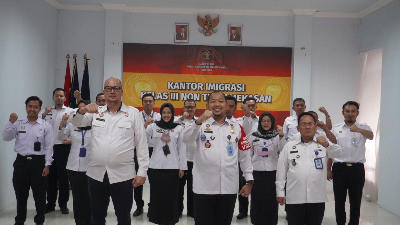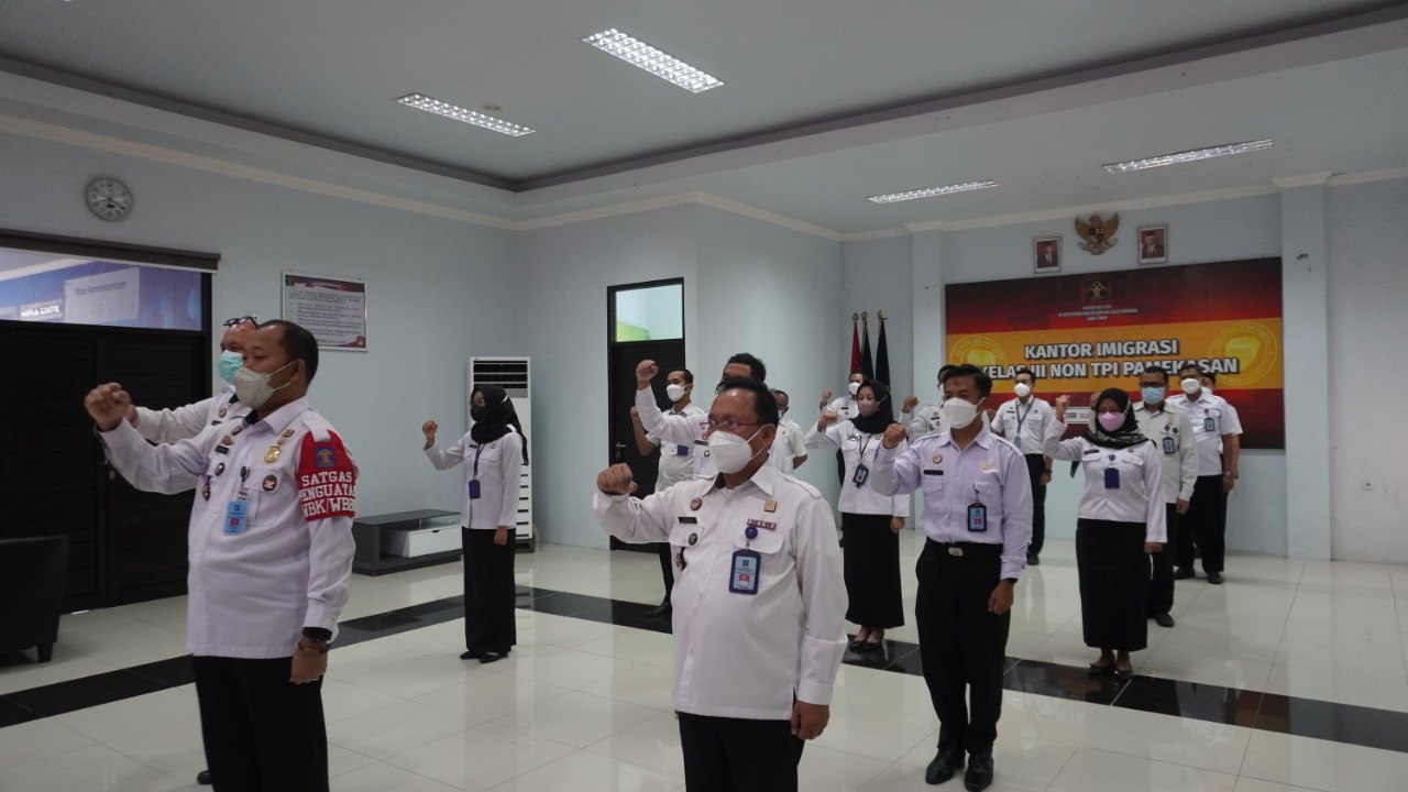 PAMEKASAN - Dalam kegiatan Apel Pagi Kementerian Hukum dan HAM (Kemenkumham) yang dilaksanakan secara serentak melalui media teleconference dan diikuti oleh seluruh Kantor Wilayah, termasuk Kanwil Kemenkumham Jawa Timur, beserta UPT se-Indonesia, Menkumham Yasonna H. Laoly menyampaikan sejumlah instruksi kepada seluruh jajarannya baik di tingkat Pusat maupun daerah. Kepala Kantor Imigrasi (Kakanim) Imam Bahri beserta pejabat struktural dan jajaran mengikuti kegiatan di Aula Ratu Pamelingan Kantor Imigrasi Kelas III Non TPI Pamekasan.