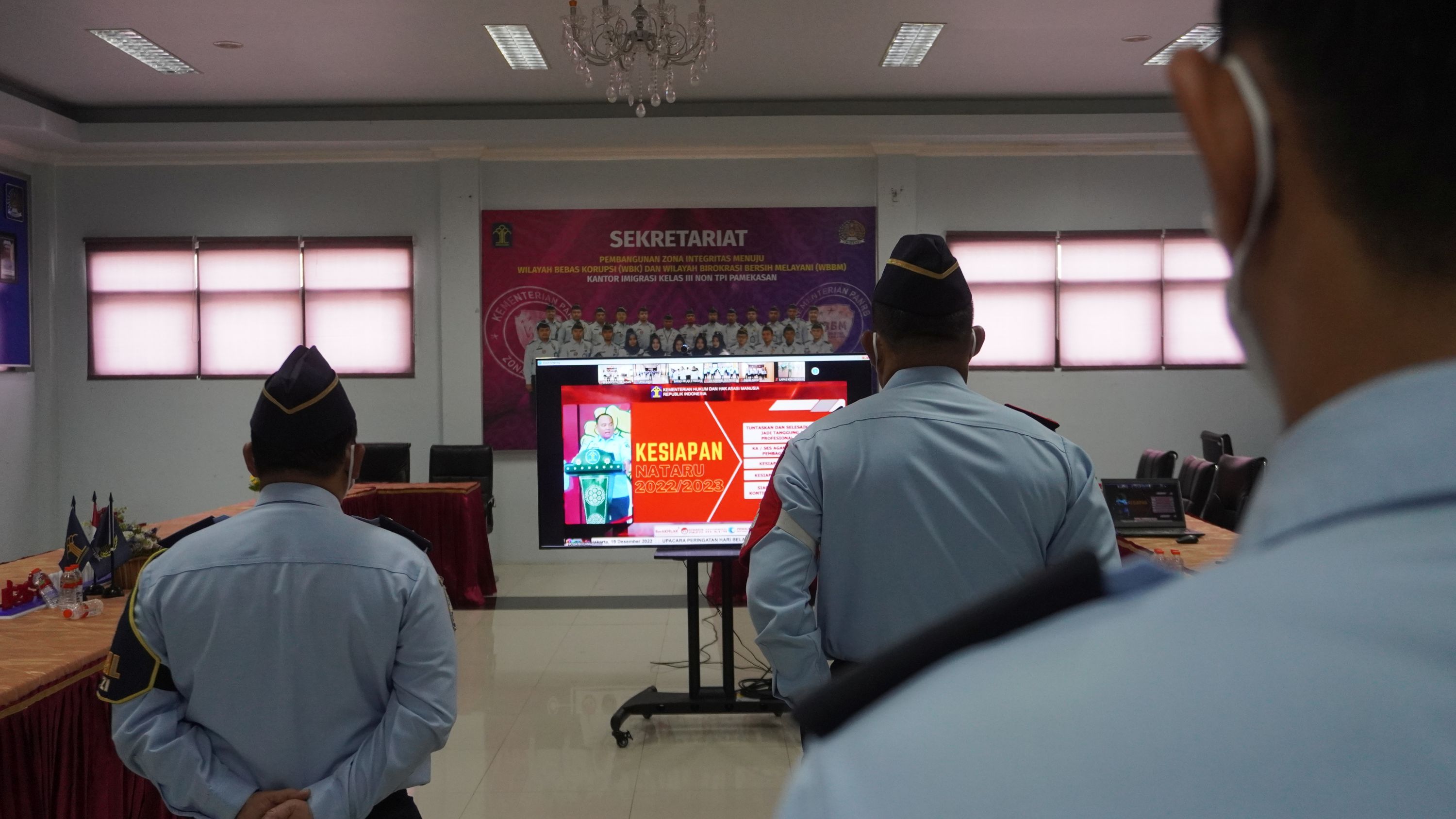 PAMEKASAN - Hari Bela Negara selalu diperingati setiap tanggal 19 Desember. Kepala Kantor, Pejabat Struktural maupun segenap ASN Kantor Imigrasi Kelas III Non TPI Pamekasan pun tak lupa mengikuti upacara guna ikut berpartisipasi dalam Peringatan ke-74 Hari Bela Negara ini pada Senin (19/12/2022). Upacara dilaksanakan secara virtual melalui aplikasi Zoom. Tak hanya untuk memperingati Hari Bela Negara, kegiatan upacara secara virtual juga dilakukan dalam rangka persiapan libur Natal dan Tahun Baru (Nataru) di lingkungan Kementerian Hukum dan HAM.