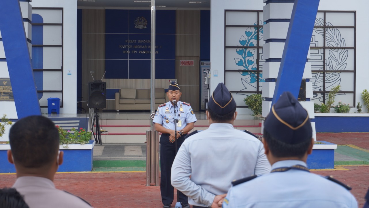 PAMEKASAN - Kepala Kantor Imigrasi (Kakanim) Kelas III Non TPI Pamekasan Kanwil Kemenkumham Jawa Timur Imam Bahri menjadi pembina apel kegiatan Apel Pagi pada Senin (02/01/2023) hari ini. Kegiatan apel pagi yang berlangsung di halaman Kantor Imigrasi Kelas III Non TPI Pamekasan ini, diikuti oleh seluruh pegawai baik ASN maupun PPNPN.