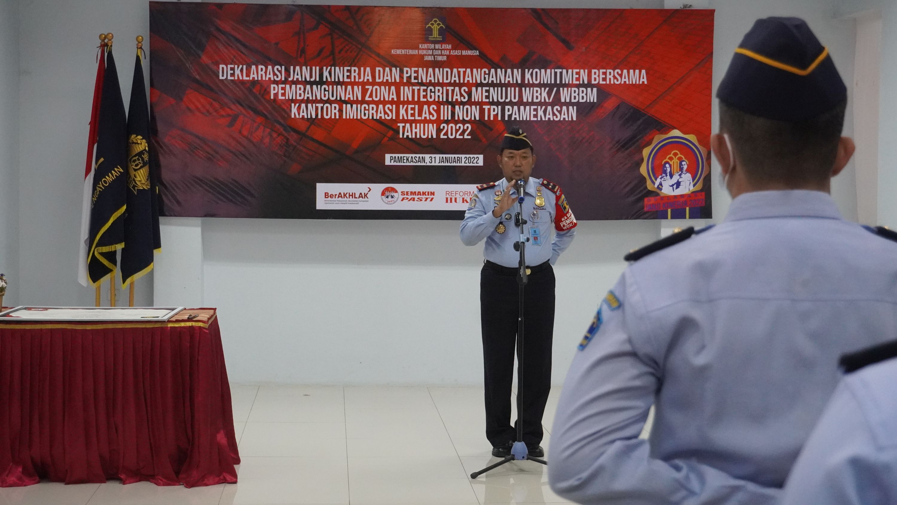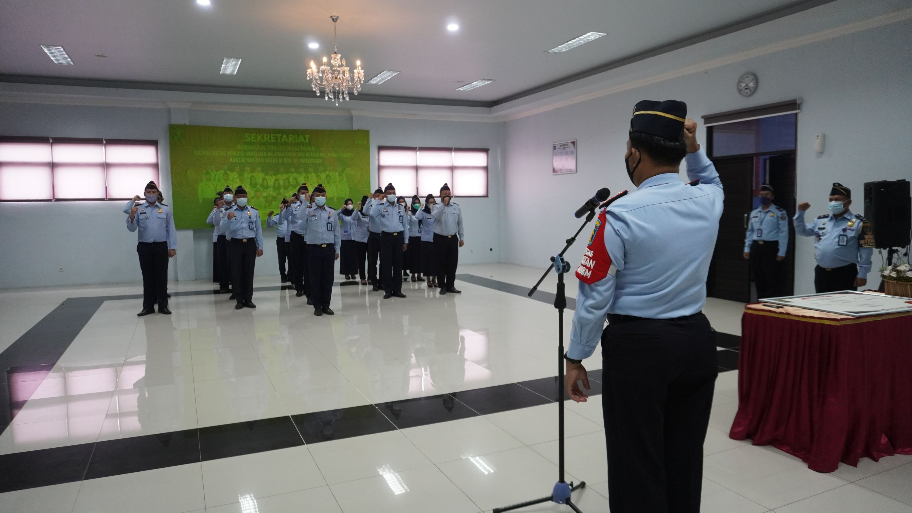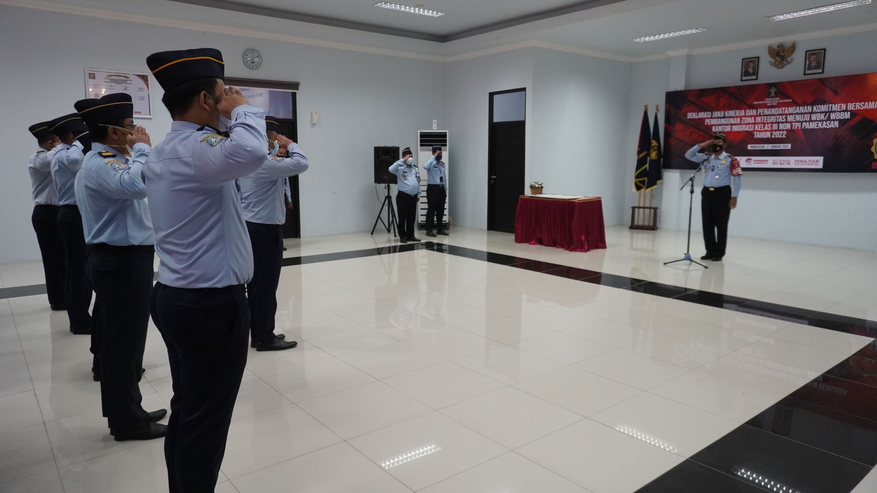 PAMEKASAN - Kegiatan apel pagi secara rutin merupakan kegiatan yang dilakukan untuk membentuk kedisiplinan pegawai. Tak terkecuali bagi Kantor Imigrasi Kelas III Non TPI Pamekasan Kanwil Kemenkumham Jawa Timur. Pagi tadi, bertindak selaku pembina apel pagi, Kepala Kantor Imigrasi Kelas III Non TPI Pamekasan Imam Bahri mengingatkan kembali kepada segenap Pegawai Kantor Imigrasi Kelas III Non TPI Pamekasan untuk menjaga kesehatan. Amanat tersebut disampaikan pada kegiatan apel pagi rutin pegawai Imigrasi Pamekasan, di Aula Ratu Pamelingan pada Senin (31/1).