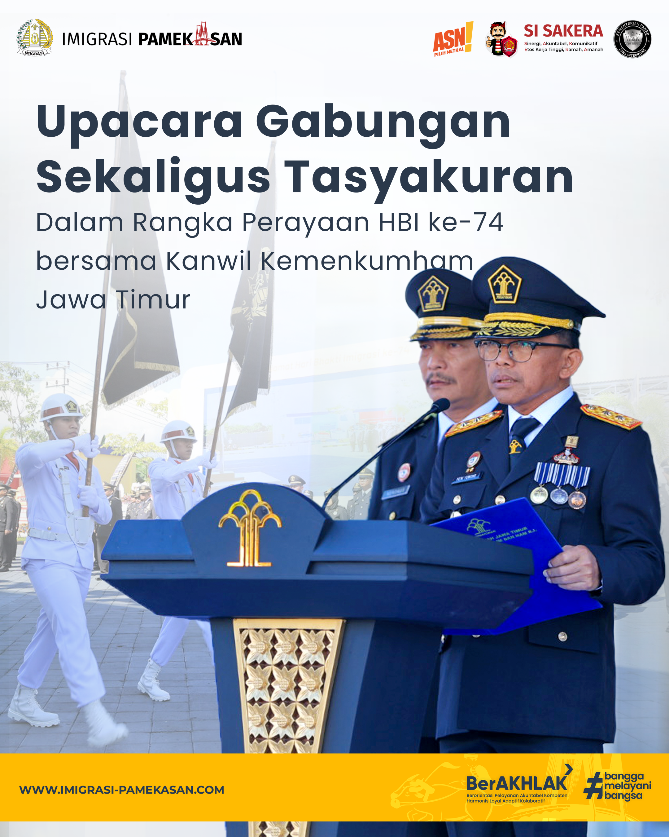 KEDIRI - Upacara peringatan Hari Bhakti Imigrasi ke-74 dilaksanakan secara serentak di seluruh Indonesia pada Jumat (26/01/2024). Jajaran UPT Imigrasi di lingkungan Kantor Wilayah Kementerian Hukum dan HAM Jawa Timur melaksanakan kegiatan Upacara di halaman Kantor Imigrasi Kelas II Non TPI Kediri.