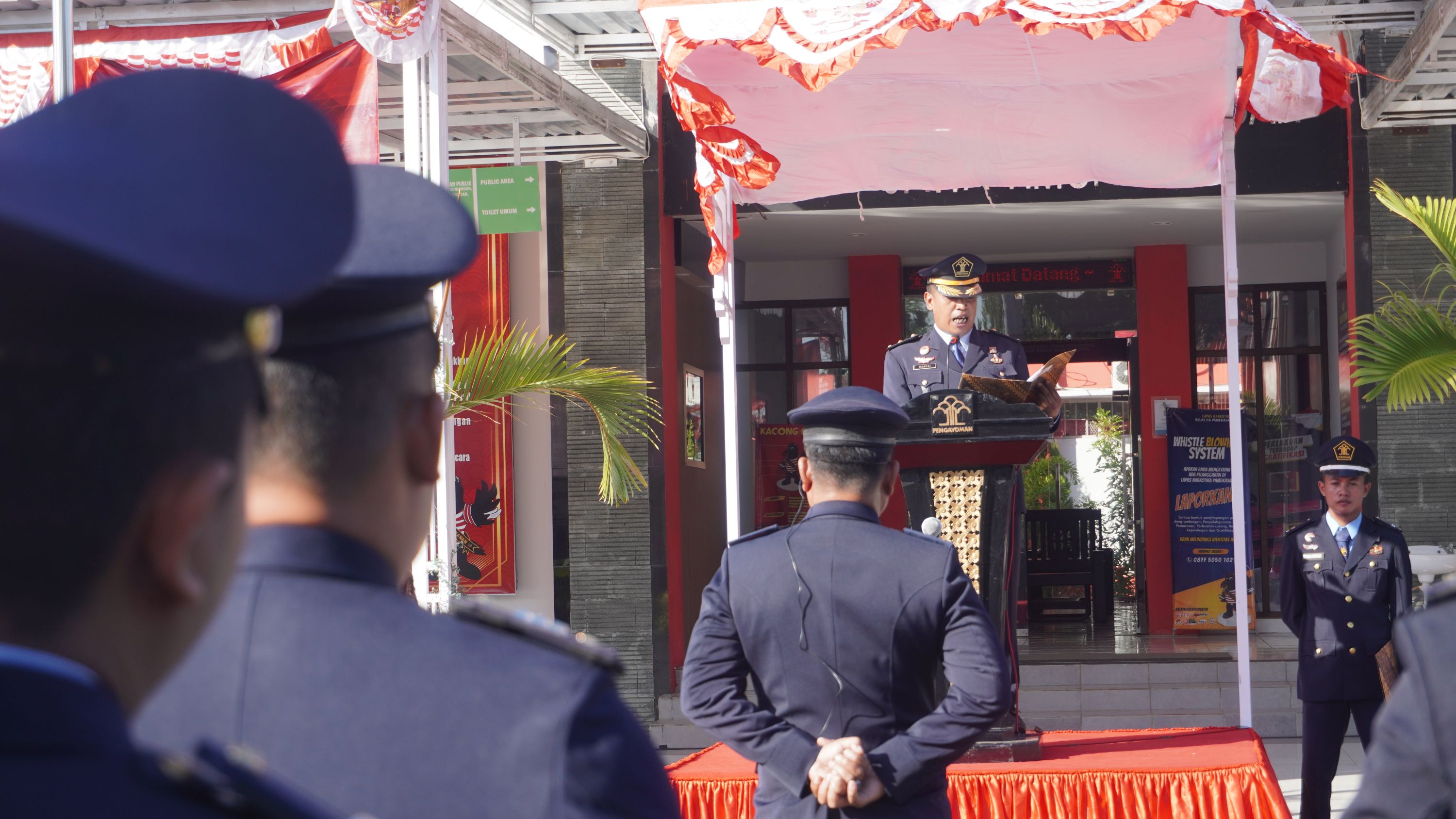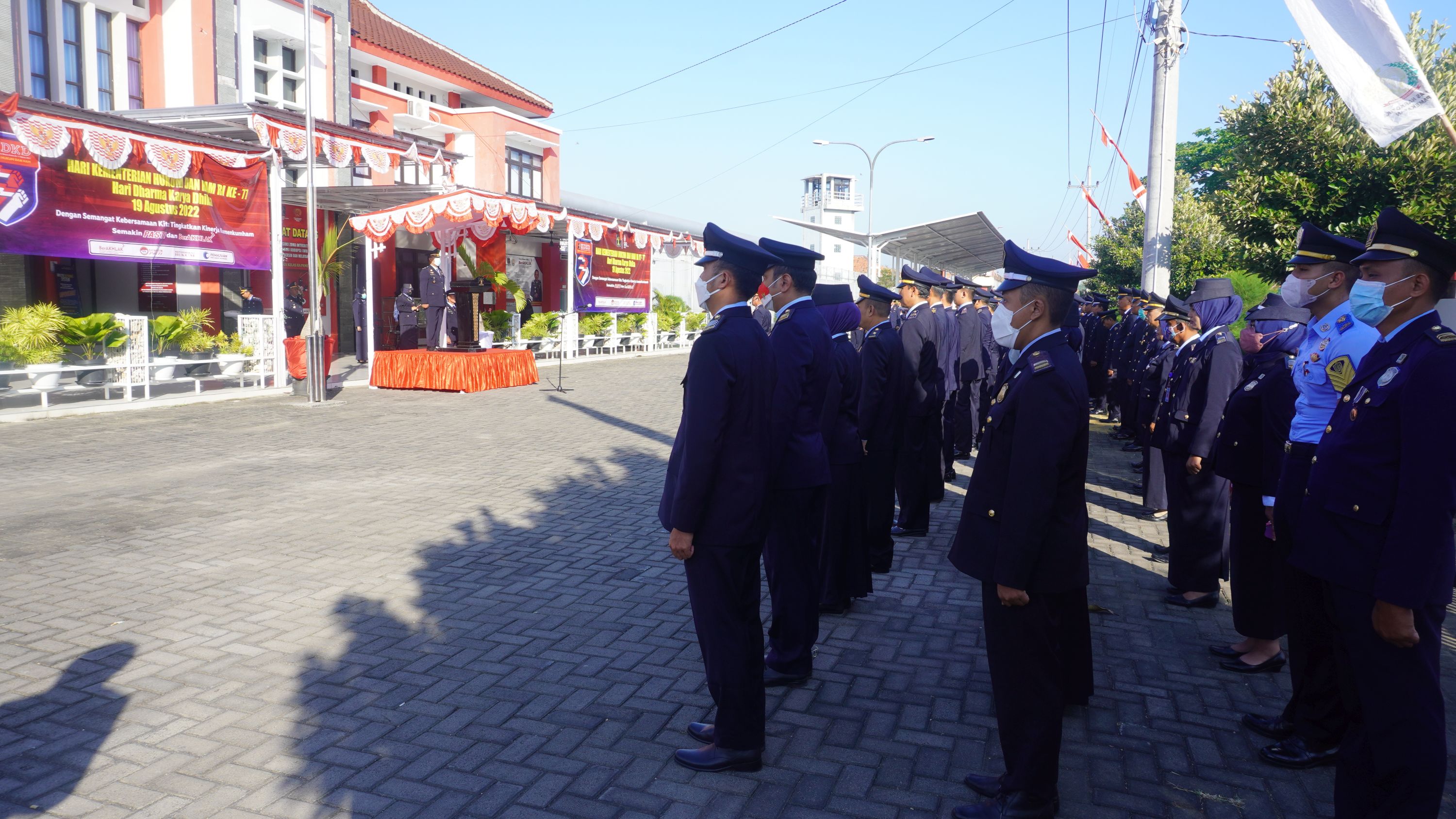 PAMEKASAN (19/8) - Jajaran Kementerian Hukum dan Hak Asasi Manusia di seluruh wilayah di Indonesia perlu menyadari bahwa mendasari indeks kepuasan masyarakat di dalam pelayanan publik demi keberhasilan pembangunan di bidang Hukum dan HAM merupakan tantangan ke depan. Jajaran perlu memperkuat kemampuan internal, meningkatkan sinergitas antar Kementerian dan Lembaga, serta membuka partisipasi masyarakat yang seluas-luasnya. Amanat Menteri Hukum dan Hak Asasi Manusia Yasonna H. Laoly tersebut disampaikan oleh Kepala Kesatuan Pengamanan Lembaga Pemasyarakatan (Ka.KPLP) Lapas Khusus Narkotika Kelas IIA Pamekasan Basuki dalam pidatonya di Upacara Peringatan Hari Dharma Karyadhika Tahun 2022 di halaman gedung Lapas Khusus Narkotika Kelas IIA Pamekasan.