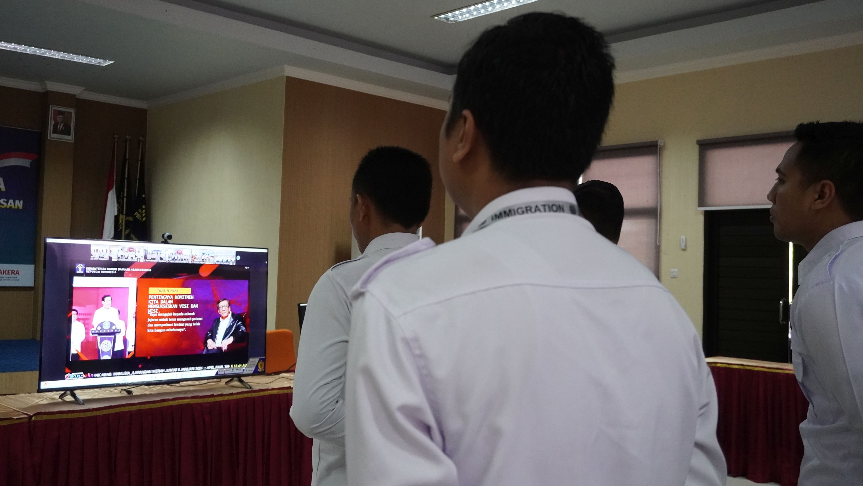PAMEKASAN - Dalam kegiatan Apel Pagi Kementerian Hukum dan HAM (Kemenkumham) yang dilaksanakan secara serentak melalui media teleconference dan diikuti oleh seluruh Kantor Wilayah, termasuk Kanwil Kemenkumham Jawa Timur, beserta UPT se-Indonesia, Menteri Hukum dan HAM Yasonna H. Laoly menyampaikan sejumlah instruksi kepada seluruh jajarannya baik di tingkat Pusat maupun daerah. Kepala Kantor Imigrasi (Kakanim) Kelas II Non TPI Pamekasan Imam Bahri beserta sebagian pejabat struktural dan jajaran mengikuti kegiatan di Kanwil Kemenkumham Jawa Timur, adapun sebagian pejabat struktural dan pegawai mengikuti kegiatan di Aula Ratu Pamelingan Kantor Imigrasi Kelas II Non TPI Pamekasan.