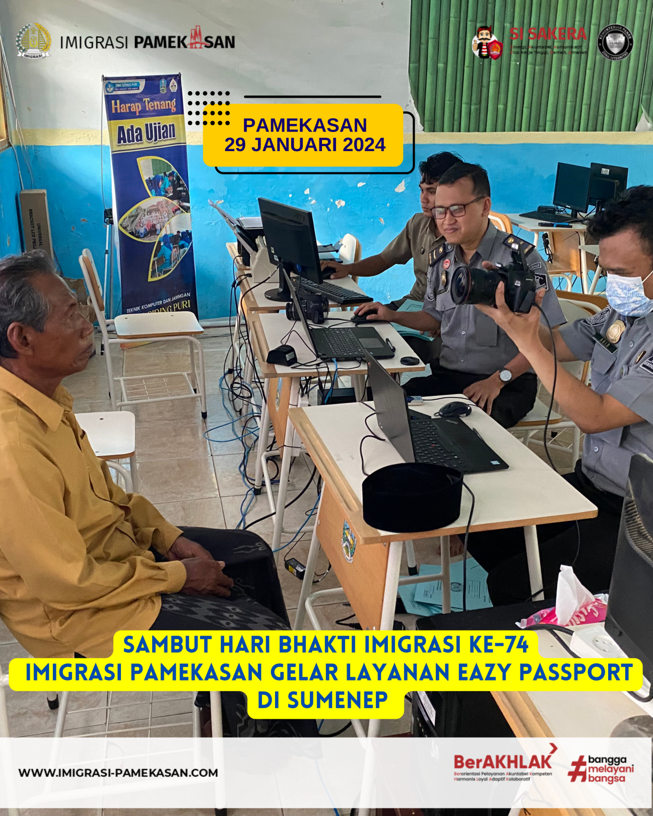 PAMEKASAN - Sebanyak 55 orang jamaah Umroh yang berada di PT. Alfir Wisata Utama yang berlokasi di Pondok Pesantren Bustanul Ulum Desa Lenteng Timur Kecamatan Lenteng Kabupaten Sumenep menerima layanan Eazy Passport pada Senin (29/01/2024). Dimulai pada pukul 10.00 waktu setempat, para jamaah dilayani oleh 2 orang petugas dari Kantor Imigrasi Kelas II Non TPI Pamekasan Kantor Wilayah Kementerian Hukum dan HAM Jawa Timur.