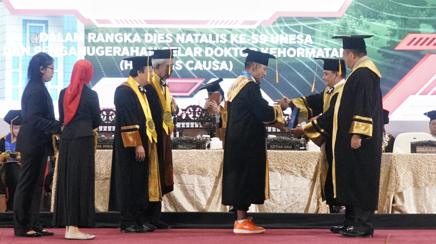 JAKARTA - Sekretaris Jenderal Kementerian Hukum dan HAM (Kemenkumham), Komjen Pol. Andap Budhi Revianto menerima Penganugerahan Gelar Doktor Kehormatan (Honoris Causa) dari Universitas Negeri Surabaya (Unesa). Wisuda penganugerahan dilakukan bersamaan dalam peringatan Dies Natalis ke-59 Unesa, Senin (14/08/2023).