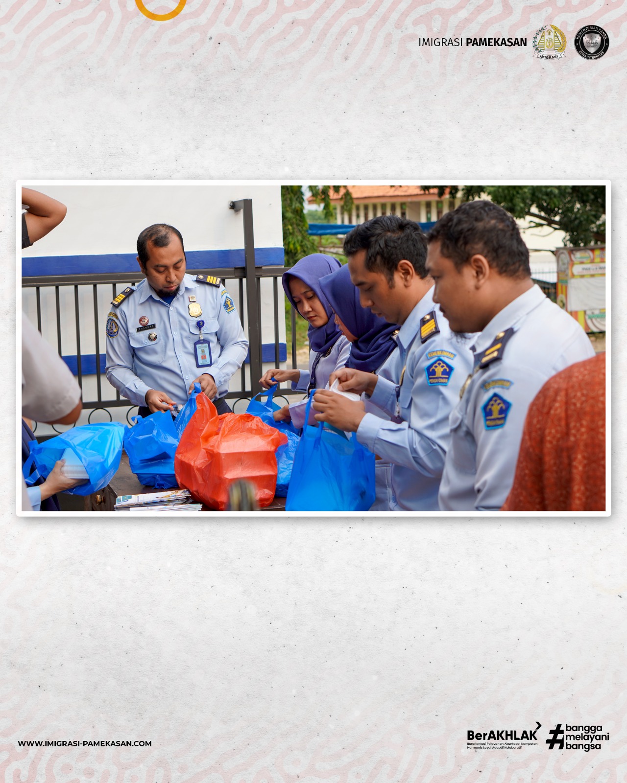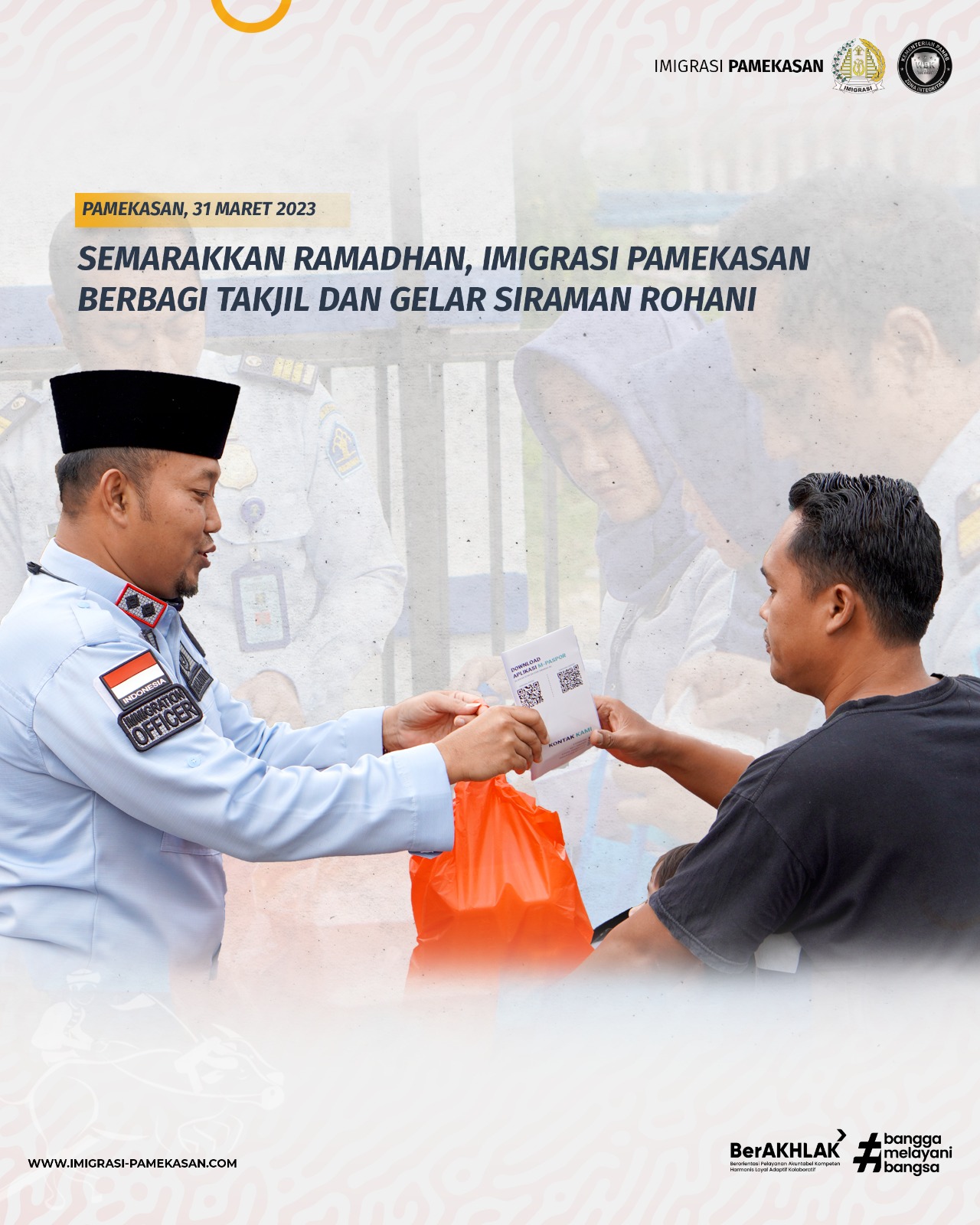Adapun yang dibagikan adalah paket berisi makanan, minuman, dan brosur layanan keimigrasian. Kegiatan ini diikuti oleh seluruh pegawai dan dipimpin langsung oleh Kepala Kantor Imigrasi Kelas II Non TPI Pamekasan Imam Bahri. Berlokasi di Jalan Raya Panglegur No 14 Tlanakan, tepatnya di depan kantor imigrasi, kegiatan ini dimulai pada pukul 16.00 WIB. Selain itu, Kepala Urusan Tata Usaha Pandu Bayuaji, Kepala Seksi Teknologi Informasi dan Komunikasi Keimigrasian Harsya Wardhana beserta Kepala Seksi Dokumen Perjalanan dan Izin Tinggal Keimigrasian Farhan Ferdiansyah juga turut hadir. Dalam kesempatan tersebut para pegawai terlihat sangat menikmati momen berbagi dengan para pengguna jalan yang melintas. Satu demi satu paket takjil yang terbungkus tas itu dibagikan kepada siapa saja yang lewat. Total ada 100 takjil yang dibagikan. Takjil sebanyak itu habis dalam waktu 15 menit saja.