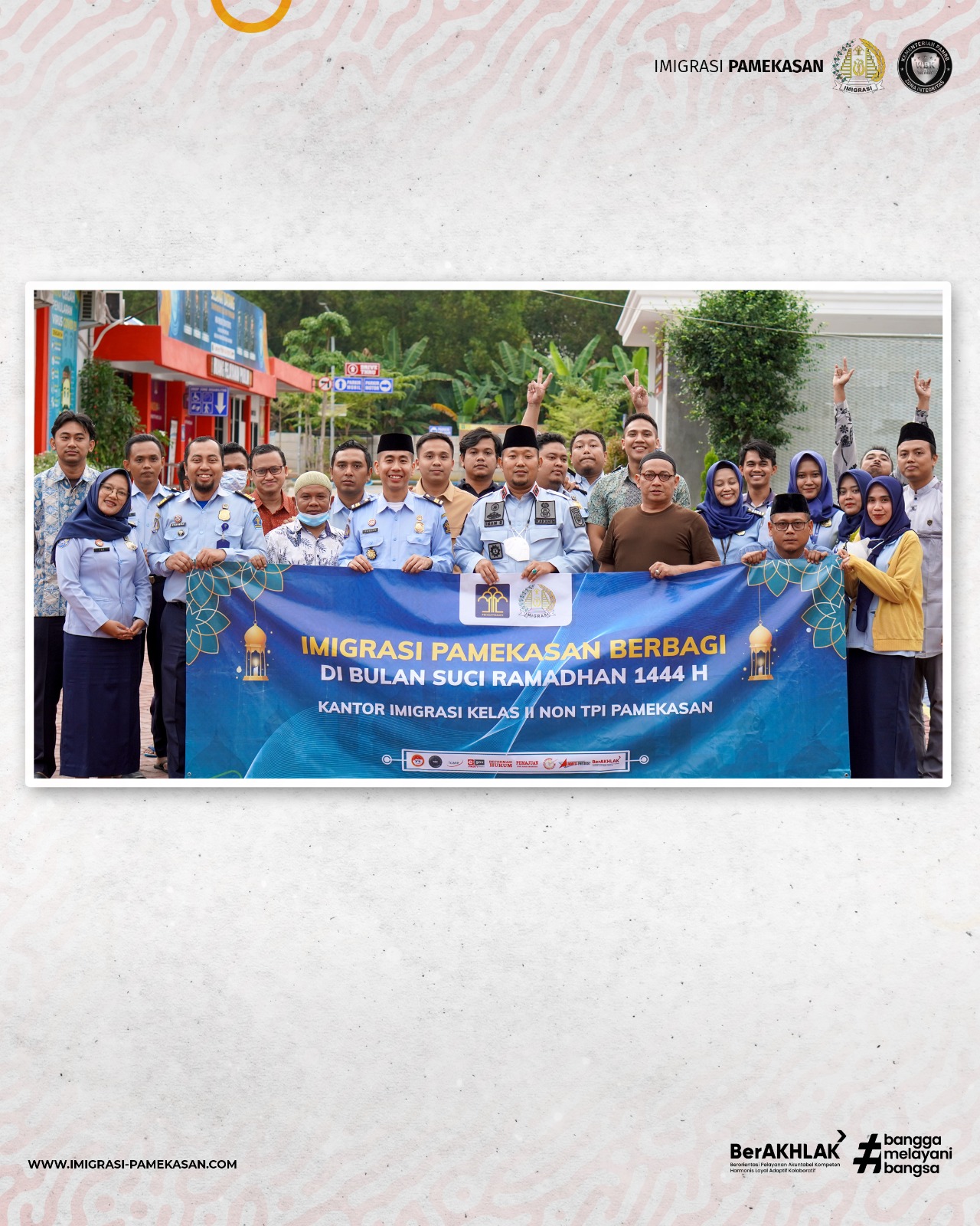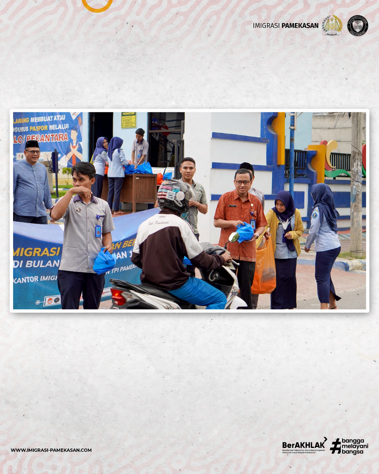 PAMEKASAN - Bulan Ramadhan tahun 1444 Hijriyah memasuki hari ke 8 pada hari Kamis (30/03/2023) kemarin. Dalam rangka menyambut bulan penuh rahmat bagi semua umat Muslim ini, Kantor Imigrasi Kelas II Non TPI Pamekasan Kanwil Kemenkumham Jawa Timur tak ingin kehilangan momentum dengan berbagi kepada masyarakat, khususnya di wilayah Pamekasan. Kegiatan berbagi dilakukan dengan berbagi takjil kepada pengendara kendaraan bermotor yang melintas di depan Kantor Imigrasi Kelas II Non TPI Pamekasan.