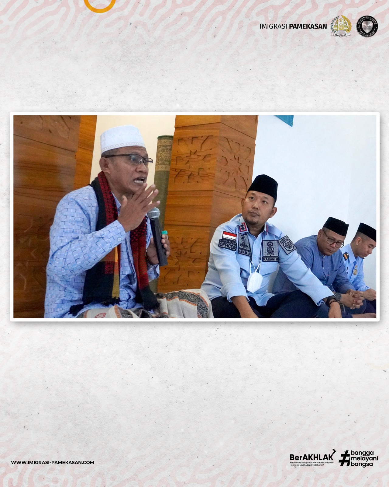 Kegiatan dilanjutkan dengan Siraman Rohani yang diselenggarakan di Mushala Imam Bukhari Kantor Imigrasi Kelas II Non TPI Pamekasan. Sebagai pembicara adalah Al-Ustadz Drs. KH Syuhada, M.Pd., dari Yayasan dan Pesantren As Sholihin Desa Panempan Kabupaten Pamekasan. KH Syuhada menekankan mengenai pentingnya bersyukur. "Syukur merupakan kunci keberhasilan di masa depan," tuturnya. Selain itu, KH Syuhada juga berpesan kepada seluruh jamaah untuk memperlambat sahur dan mempercepat berbuka. "Hal ini merupakan sunnah Rasulullah junjungan kita, Nabi Muhammad Shalallahu Alaihi Wassalam," himbaunya. Kegiatan siraman rohani diakhiri dengan shalat Maghrib berjamaah. (alfa/imigrasipamekasan)