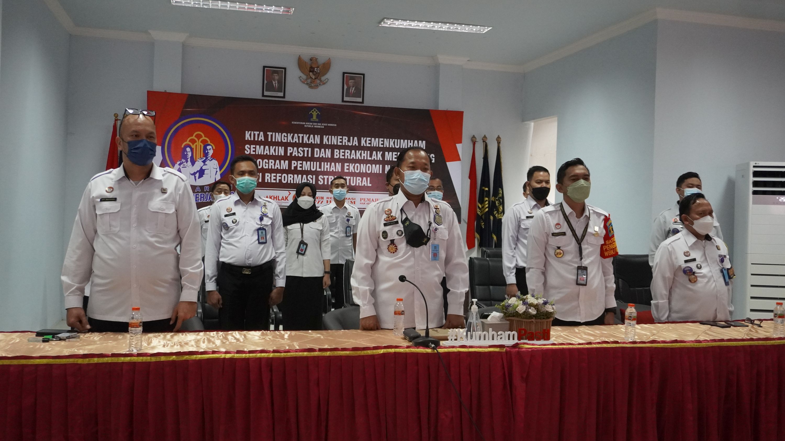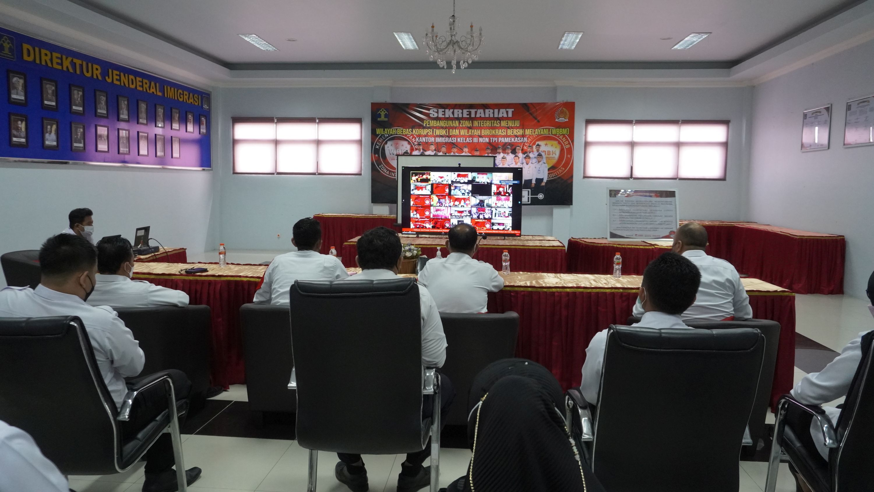 PAMEKASAN - Kementerian Hukum dan HAM Republik Indonesia melaksanakan kegiatan Deklarasi Janji Kinerja serta Penandatanganan Komitmen Bersama Pembangunan Zona Integritas Menuju Wilayah Bebas Korupsi (WBK) dan Wilayah Birokrasi Bersih Melayani (WBBM) Kemenkumham Republik Indonesia Tahun 2022 di Graha Pengayoman, Kamis (06/01). Kantor Imigrasi Kelas III Non TPI Pamekasan sebagai salah satu satuan kerja di bawah Kementerian Hukum dan HAM mengikuti kegiatan ini secara virtual melalui aplikasi Zoom. Berlangsung di aula Ratu Pamelingan, kegiatan ini diikuti oleh Kepala Kantor Imigrasi Imam Bahri, para pejabat struktural, serta seluruh pegawai.