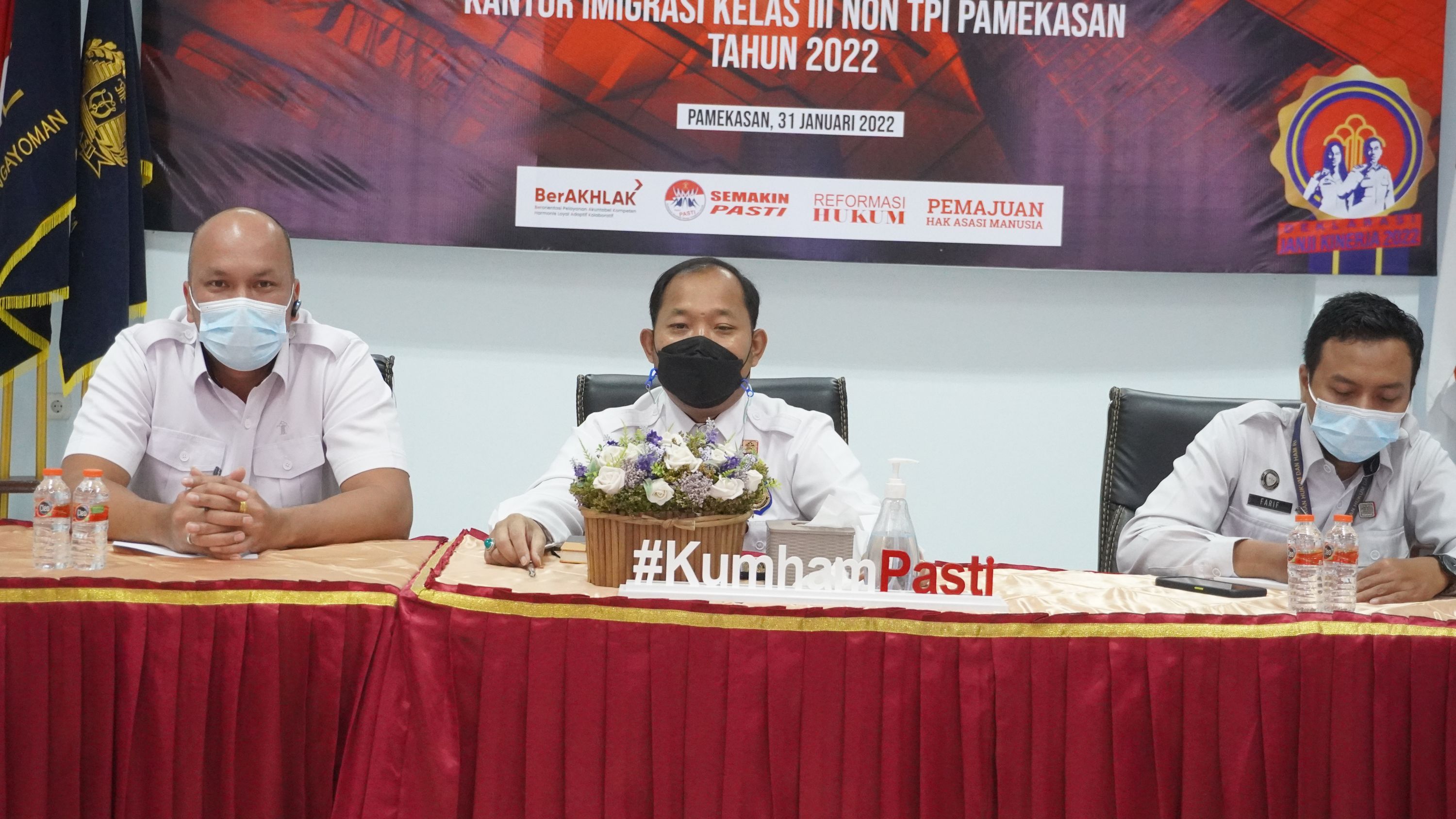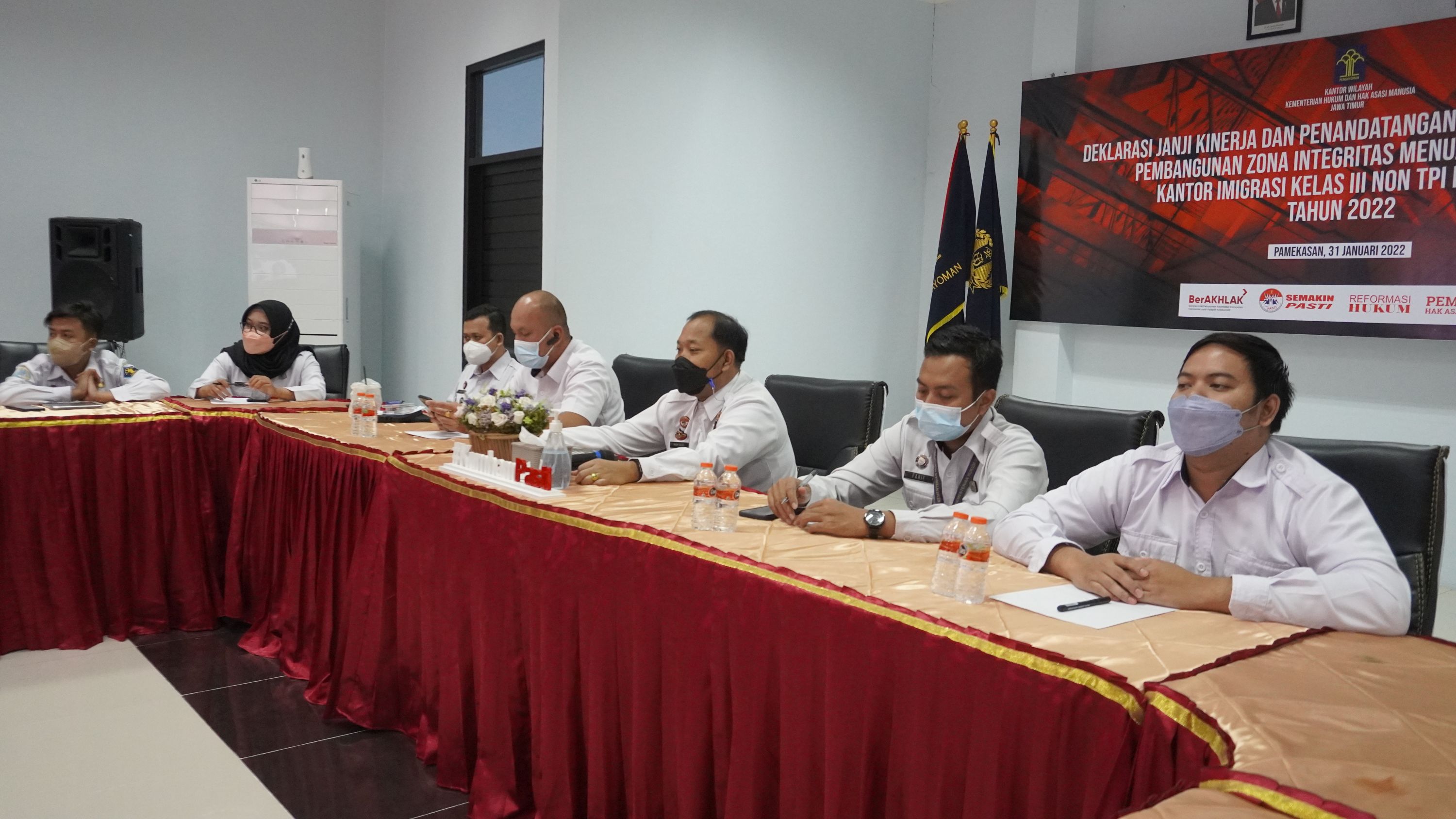 PAMEKASAN - Kantor Imigrasi Kelas III Non TPI Pamekasan Kanwil Kemenkumham Jawa Timur selalu berbenah diri, terutama dalam bidang pelayanan paspor maupun izin tinggal, yang diwujudkan dengan inovasi dalam bentuk pelayanan maupun aplikasi yang dapat mempermudah pemohon paspor maupun izin tinggal dalam pengajuan maupun pemrosesan permohonannya. Hal ini merupakan wujud komitmen dalam pembangunan Zona Integritas menuju Wilayah Birokrasi Bersih dan Melayani (WBBM). Oleh karena itu, Kepala Kantor Imigrasi bersama pejabat struktural dan pegawai yang ditunjuk sebagai Pokja mengikuti Workshop Zona Integritas secara virtual.